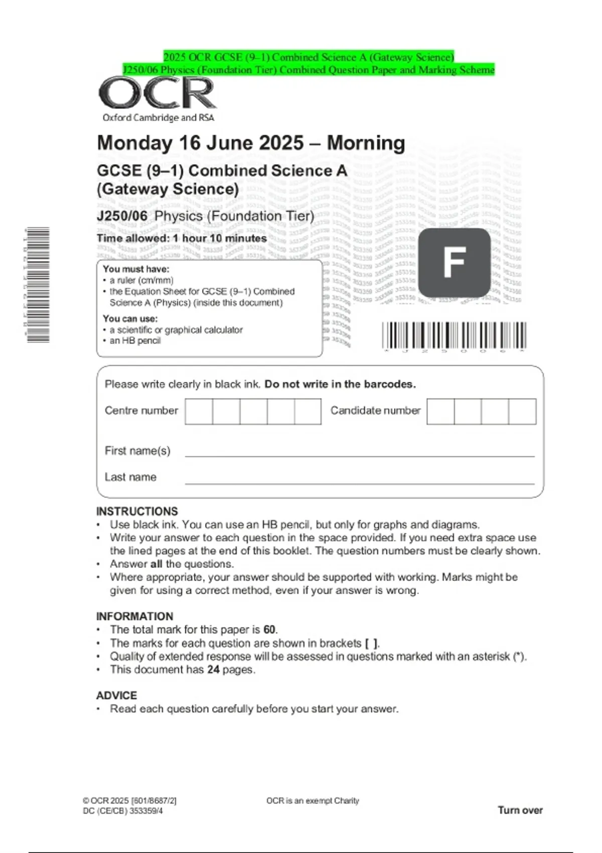 2025 OCR GCSE (9–1) Combined Science A (Gateway Science) J250/06 Physics (Foundation Tier) Combined Question Paper and Marking Scheme