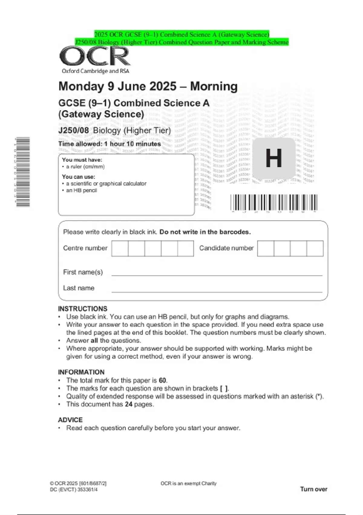 2025 OCR GCSE (9–1) Combined Science A (Gateway Science) J250/08 Biology (Higher Tier) Combined Question Paper and Marking Scheme