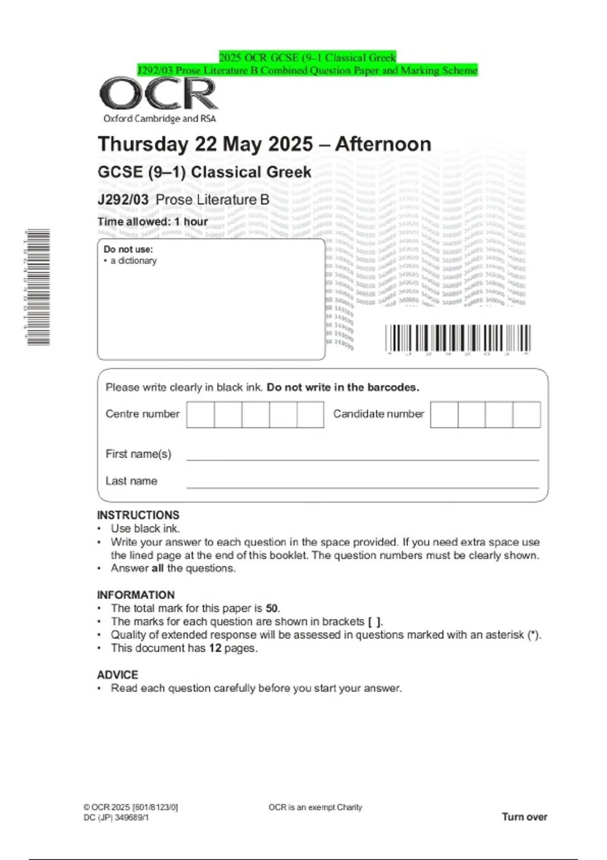 PACKAGE DEAL_::2025 OCR GCSE (9–1 Classical Greek EXAMS|COMBINED QUESTION PAPER AND FINAL MARKING SCHEME