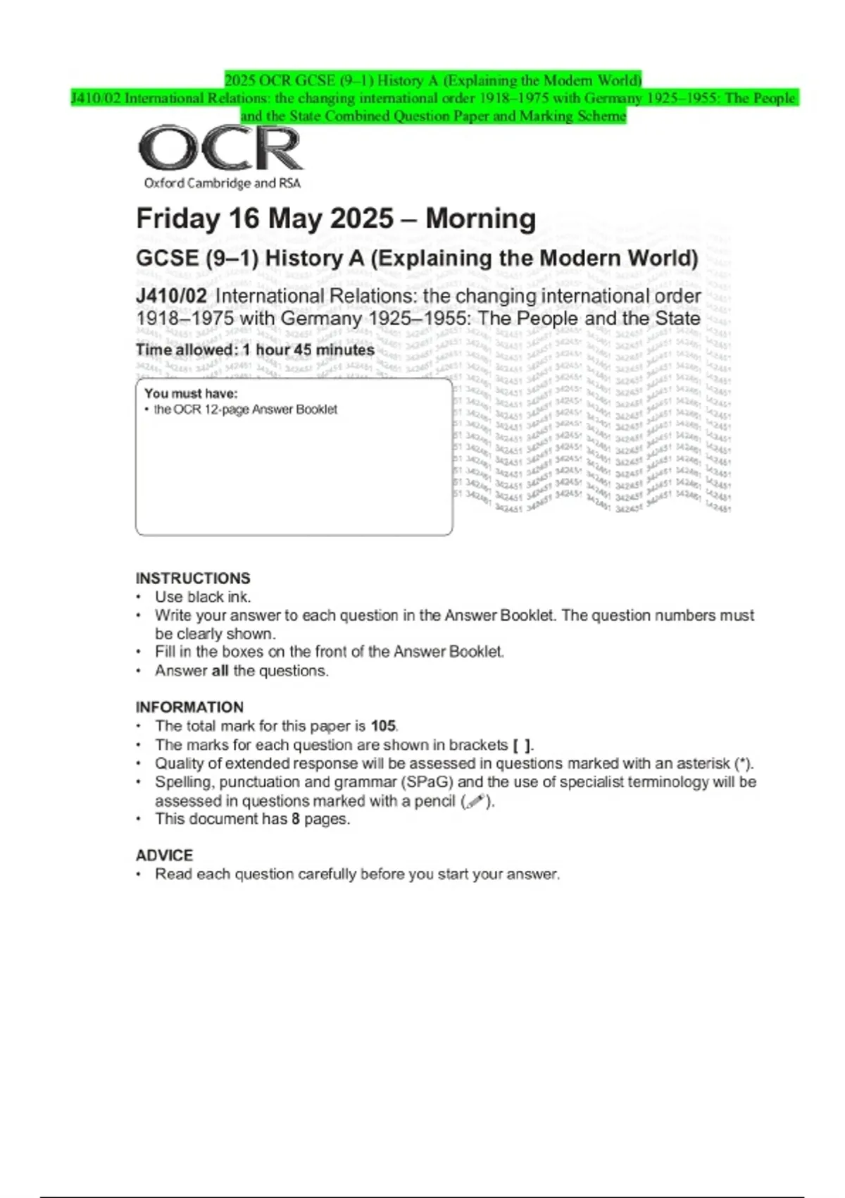 2025 OCR GCSE (9–1) History A (Explaining the Modern World) J410/02 International Relations: the changing international order 1918–1975 with Germany 1925–1955: The People and the State Combined Question Paper and Marking Scheme