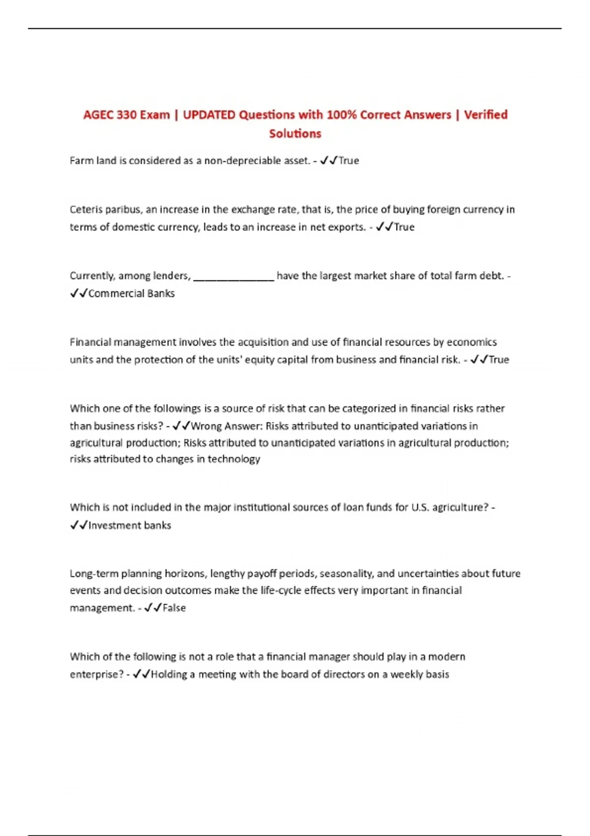 AGEC 330 Exam | UPDATED Questions with 100% Correct Answers | Verified Solutions