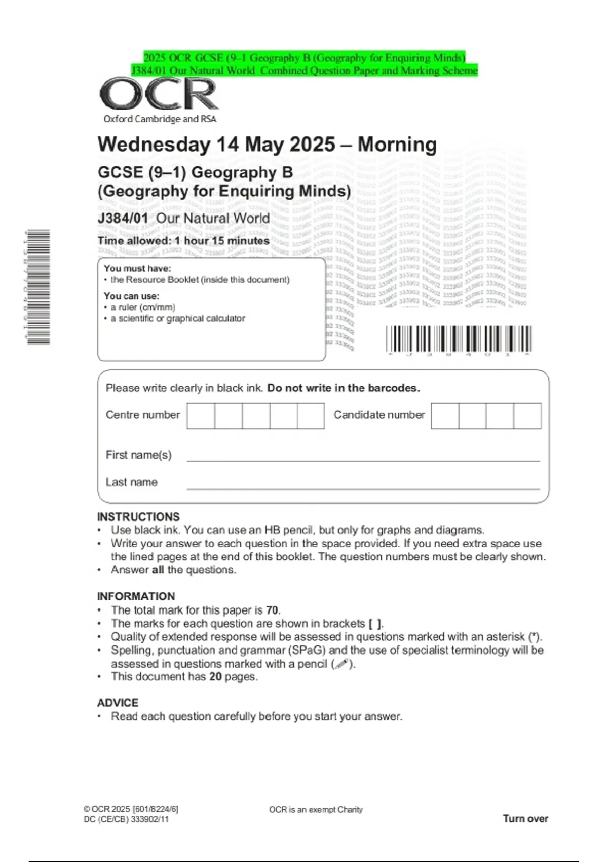 PACKAGE DEAL-::2025 OCR GCSE (9–1] Geography B (Geography for Enquiring Minds)Exams|COMBINED QUESTION PAPER AND FINAL MARKING SCHEME