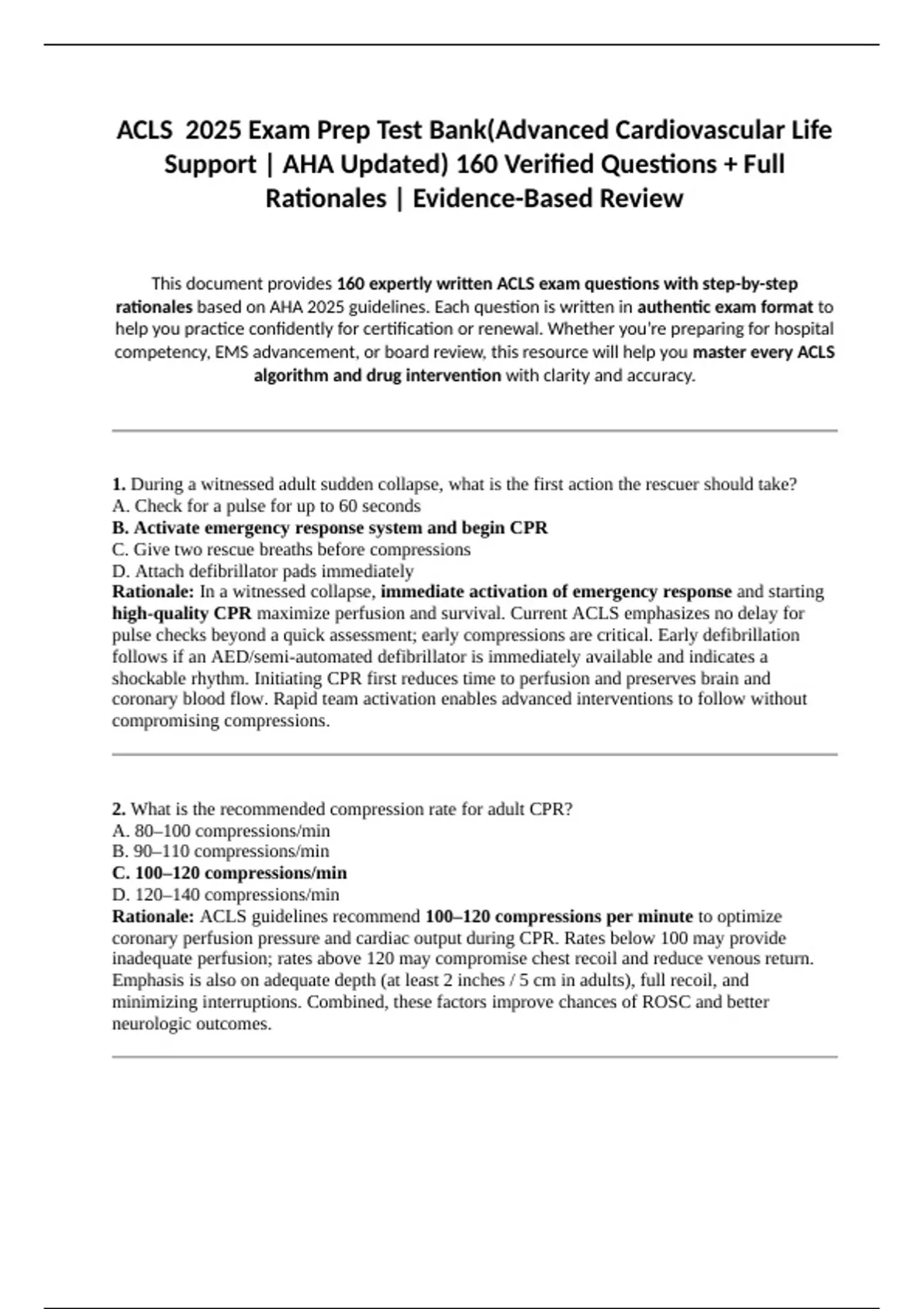 This document provides 160 expertly written ACLS exam questions with step-by-step