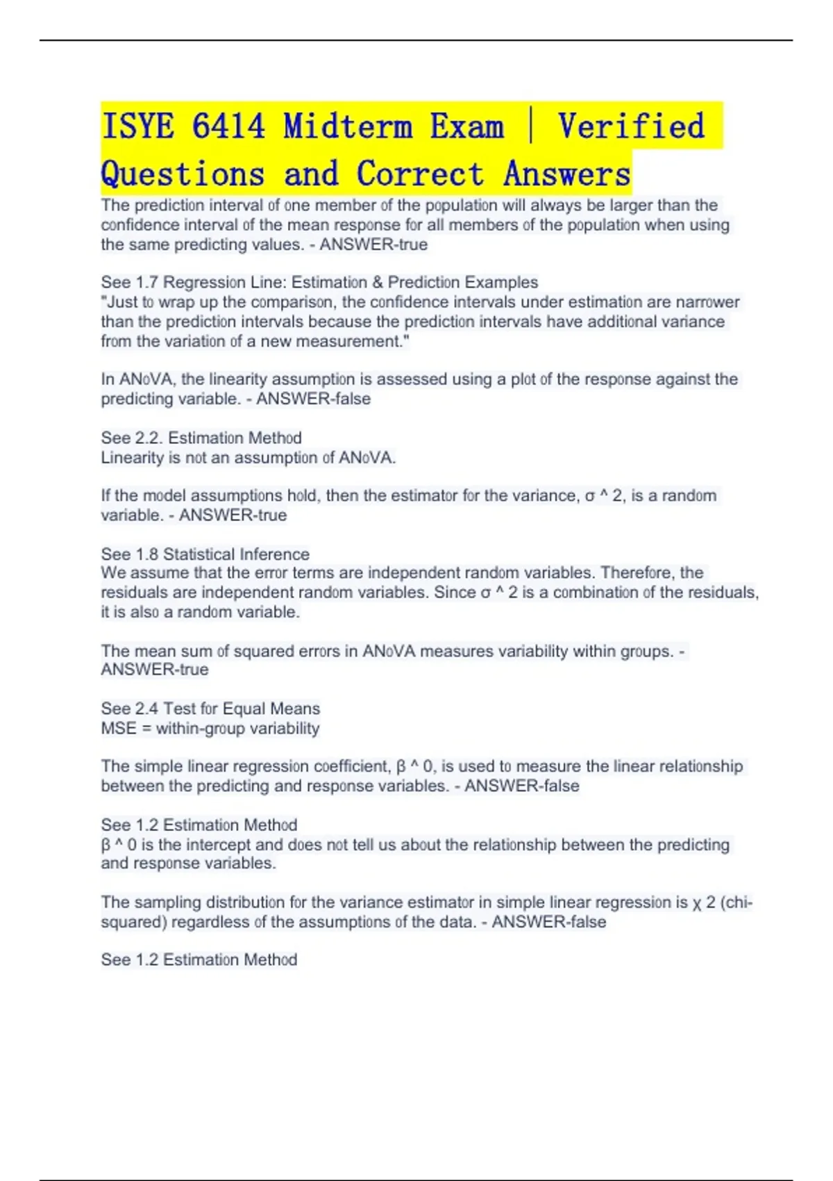Complete ISYE 6414 Midterm Exam with verified questions and correct answers. Great for quick review and strengthening your understanding of course concepts.