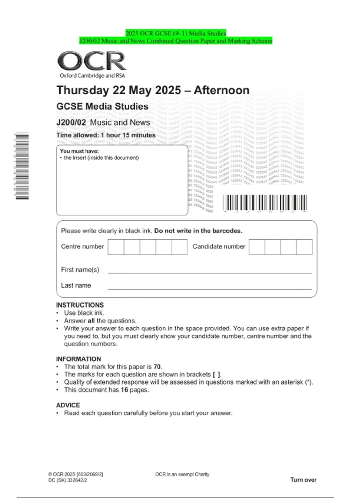 2025 OCR GCSE (9–1) Media Studies J200/02 Music and News Combined Question Paper and Marking Scheme