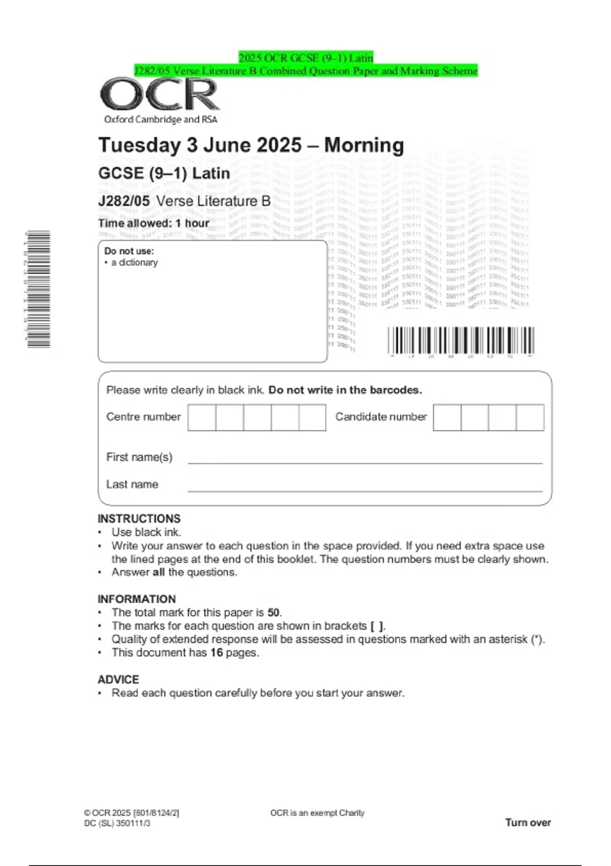 PACKAGE DEAL-::2025 OCR GCSE (9–1) Latin J282/04 Verse literature EXAMS|COMBINED QUESTION PAPER AND MARKING SCHEME