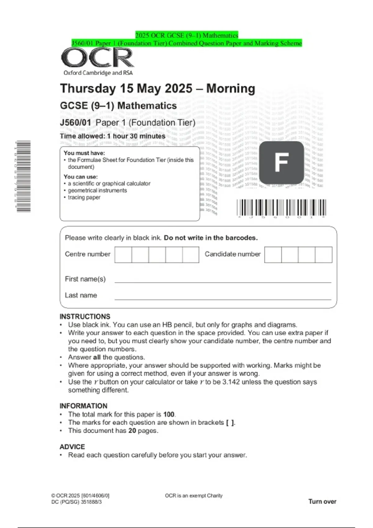 2025 OCR GCSE (9–1) Mathematics J560/01 Paper 1 (Foundation Tier) Combined Question Paper and Marking Scheme