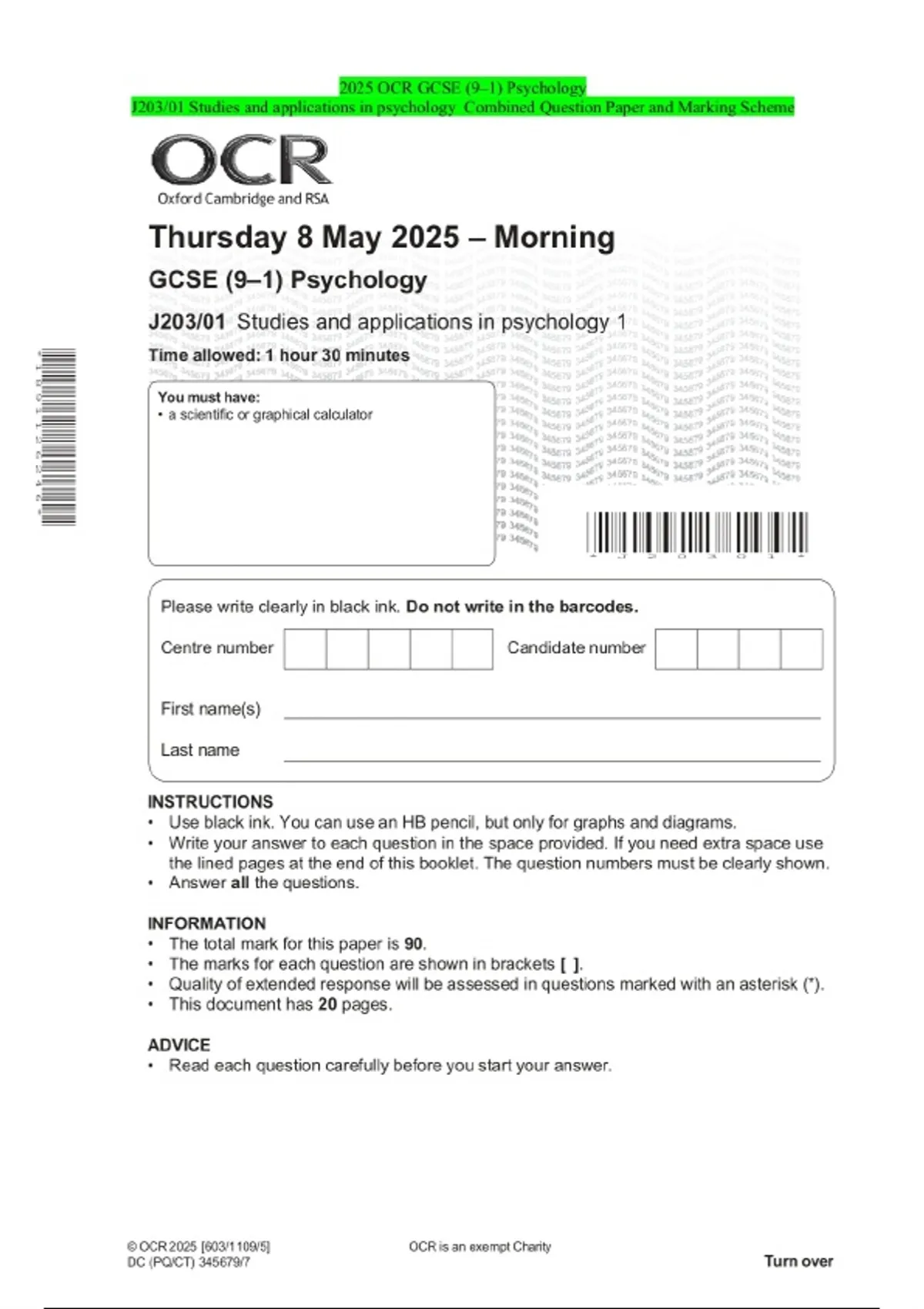 2025 OCR GCSE (9–1) Psychology J203/01 Studies and applications in psychology Combined Question Paper and Marking Scheme