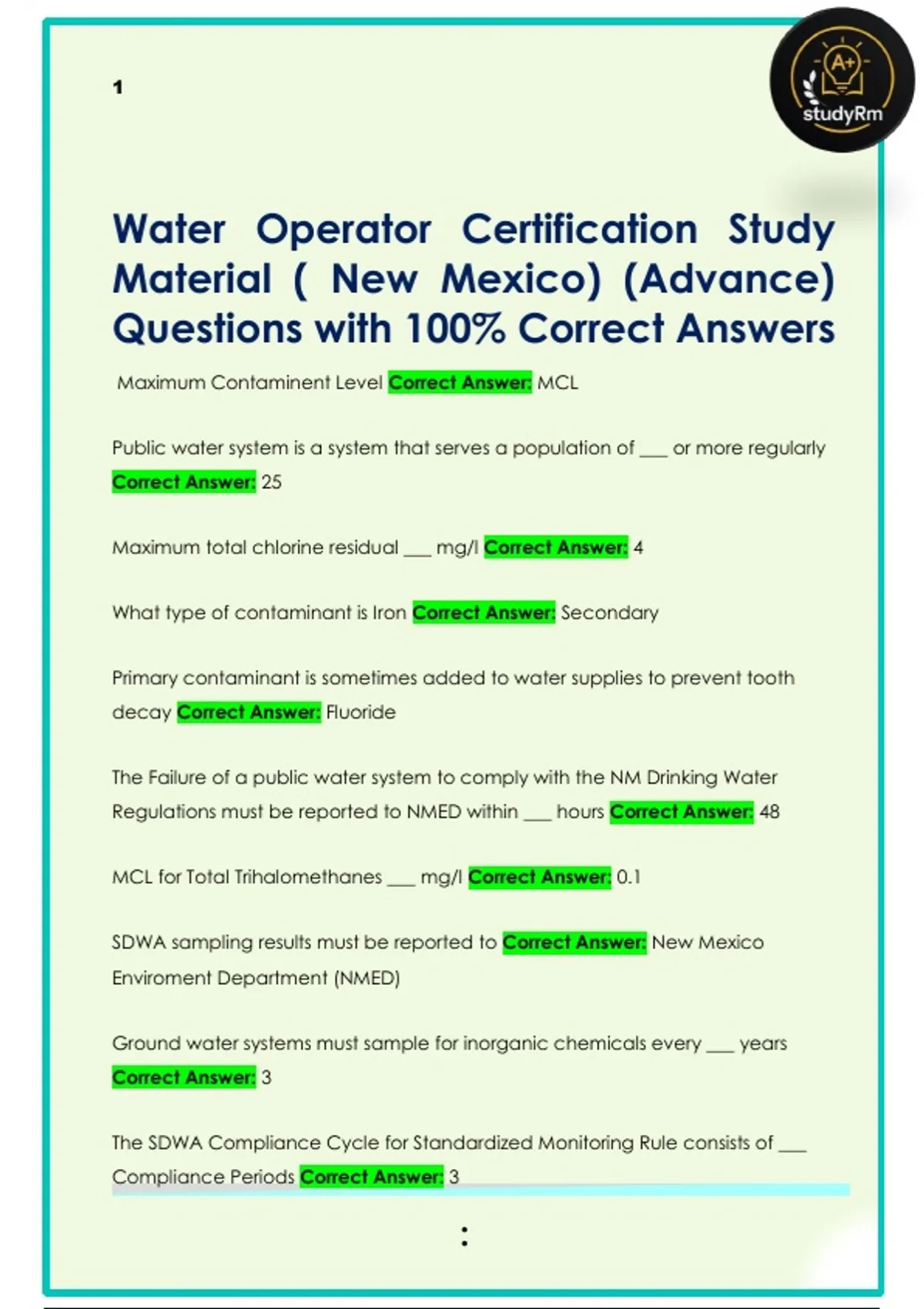 Water Operator Certification Study Material ( New Mexico) (Basic) Questions with 100% Correct Answers