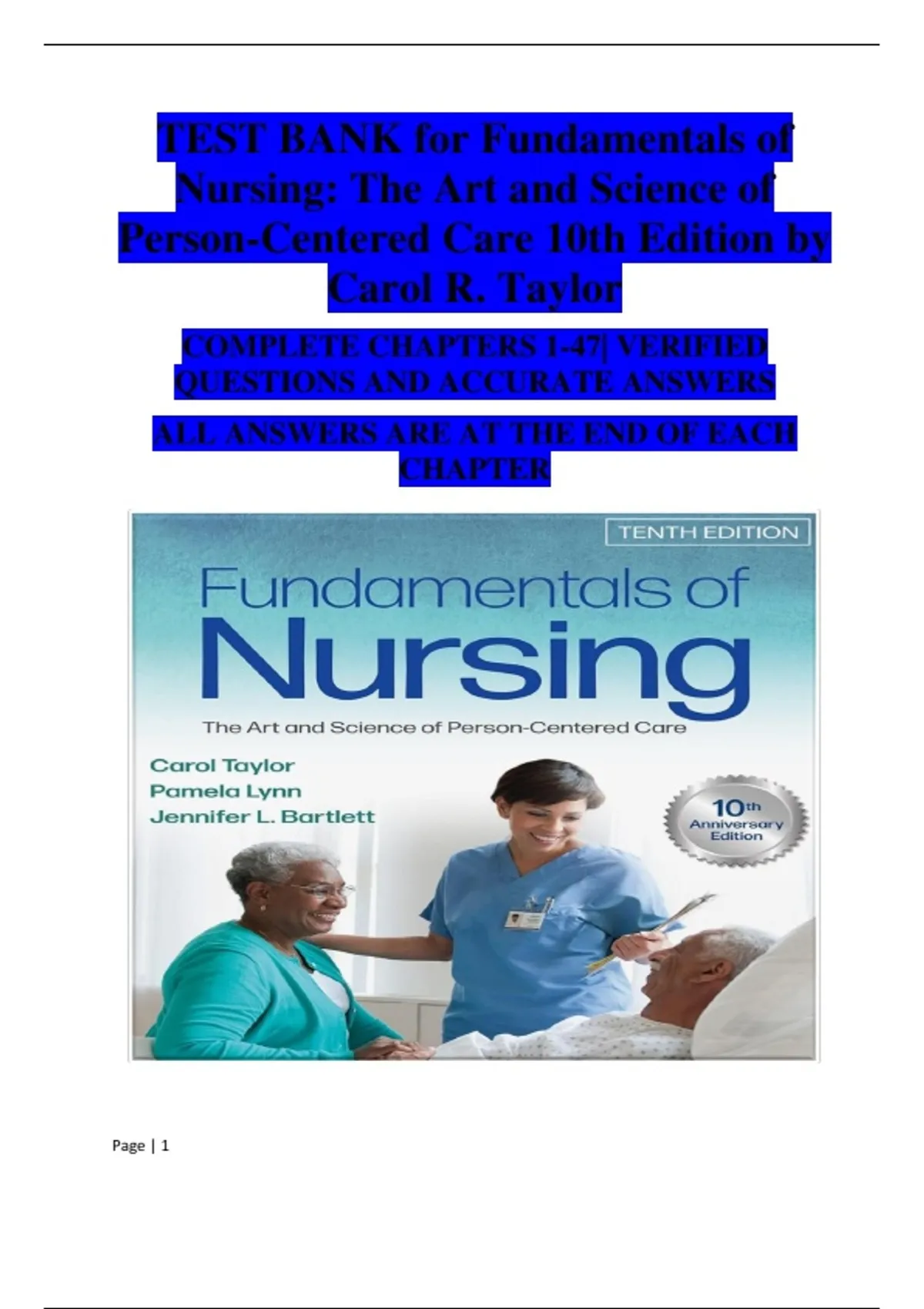 This document contains the complete verified test bank for Fundamentals of Nursing: The Art and Science of Person-Centered Care (10th Edition) by Carol R. Taylor, covering Chapters 1 through 47. It includes multiple-choice questions with accurate answer keys for every chapter. The material spans all major units, including foundations of nursing practice, health care delivery, person-centered processes, developmentally appropriate care, physiologic and psychosocial responses, and culturally respectful care. It is well-structured and suitable for exam preparation and coursework support.