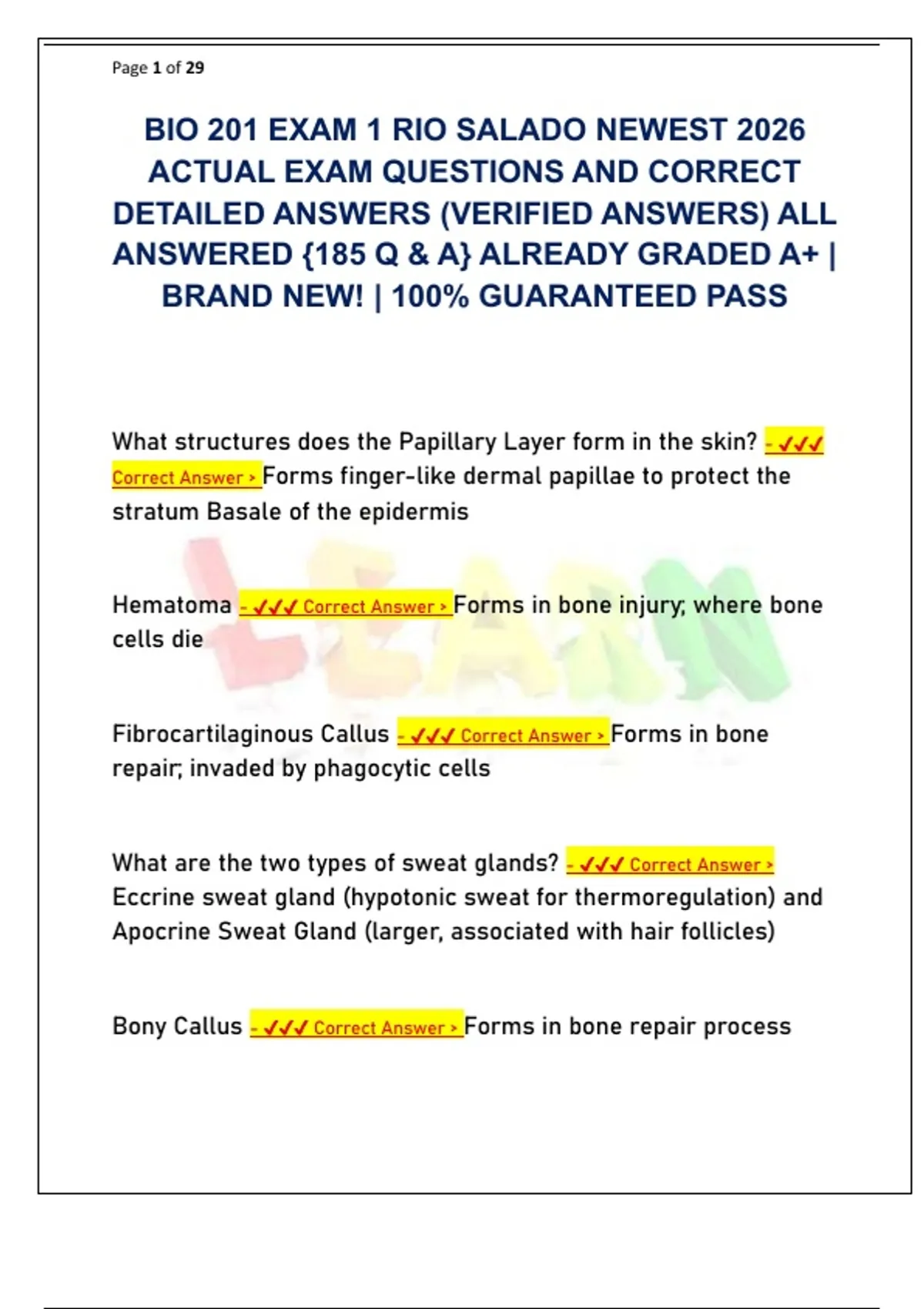 BIO 201 EXAM 1 RIO SALADO NEWEST 2026 ACTUAL EXAM QUESTIONS AND CORRECT DETAILED ANSWERS (VERIFIED ANSWERS) ALL ANSWERED {185 Q & A} ALREADY GRADED A+ | BRAND NEW! | 100% GUARANTEED PASS What structures does the Papillary Layer form in the skin? - Correct Answer Forms finger-like dermal papillae to protect the stratum Basale of the epidermis