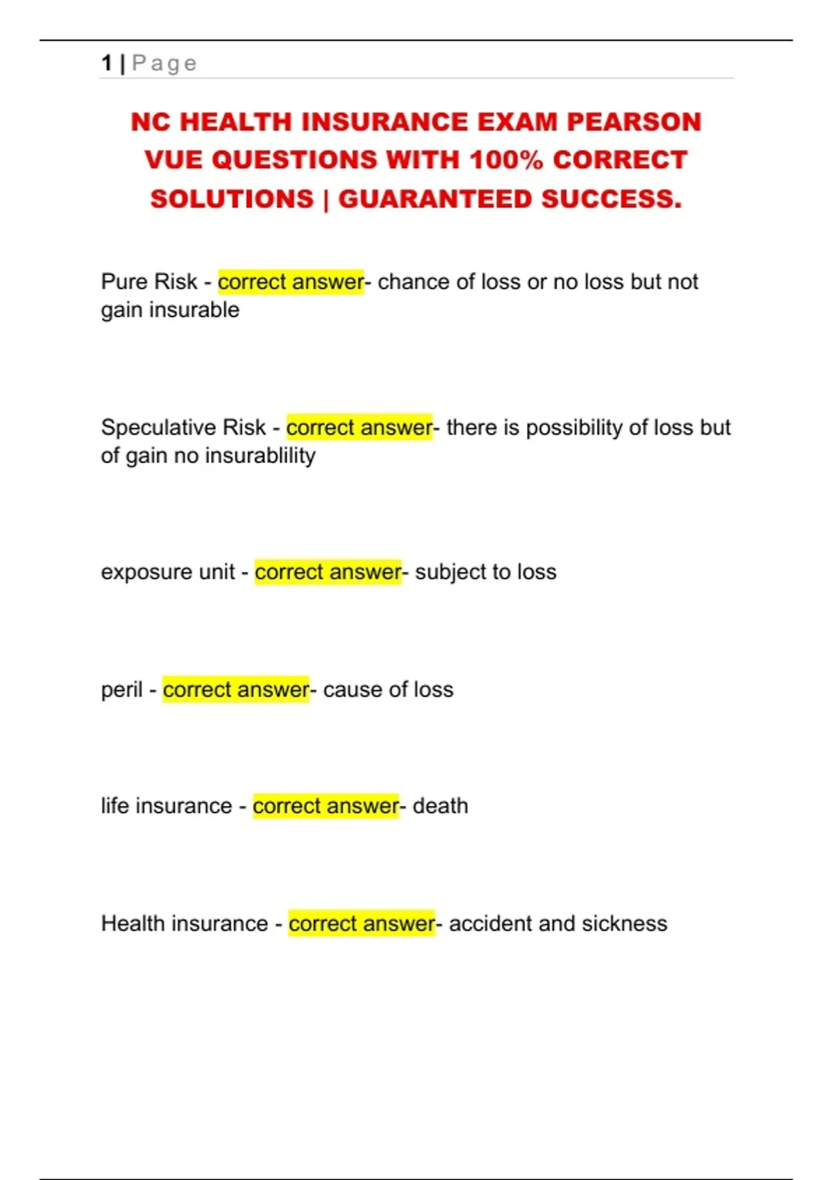 NC HEALTH INSURANCE EXAM PEARSON