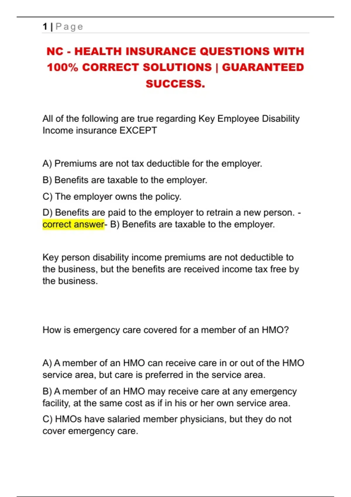 NC - HEALTH INSURANCE QUESTIONS WITH 100% CORRECT SOLUTIONS | GUARANTEED SUCCESS.