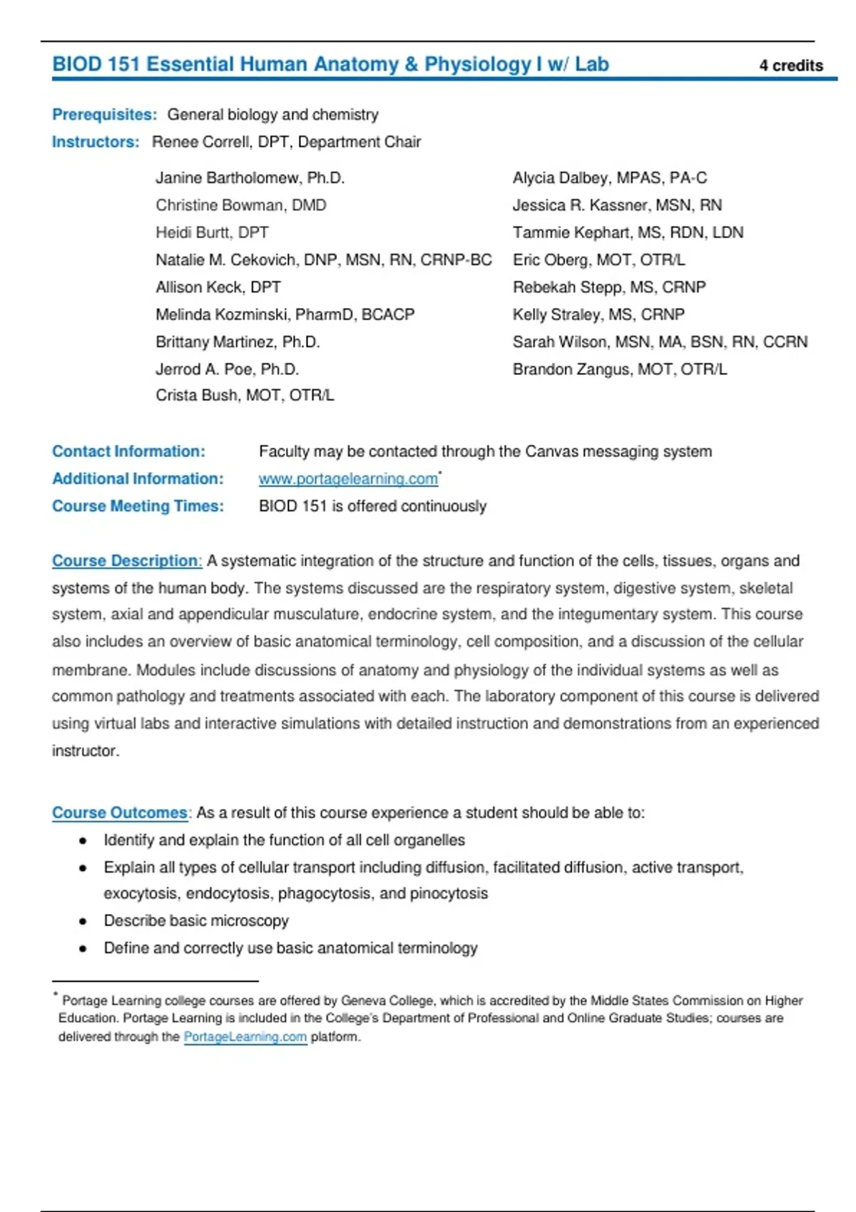BIOD 151 Essential Human Anatomy & Physiology I w/ Lab 4 credits