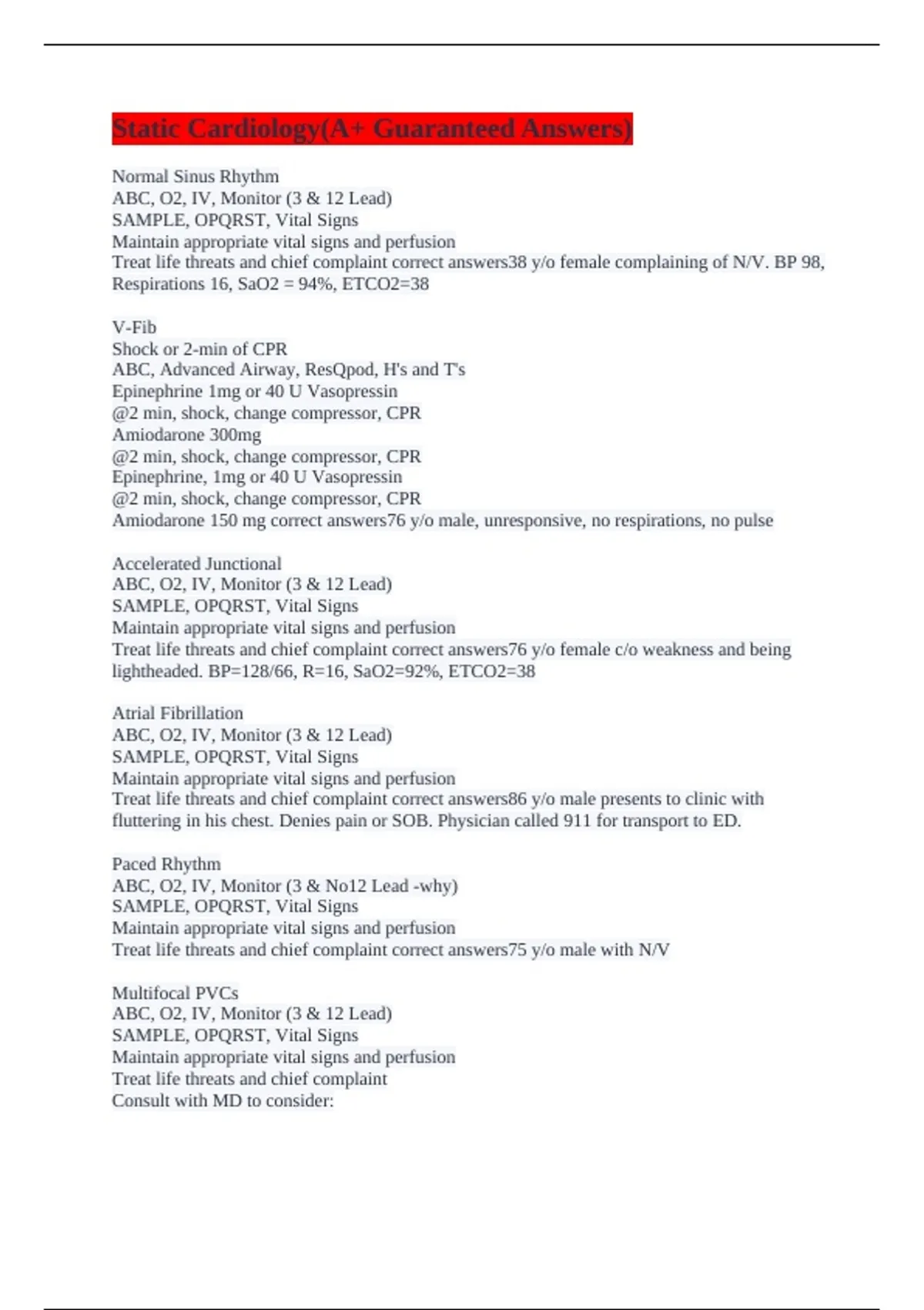 Normal Sinus Rhythm ABC, O2, IV, Monitor (3 & 12 Lead) SAMPLE, OPQRST, Vital Signs Maintain appropriate vital signs and perfusion Treat life threats and chief complaint correct answers38 y/o female complaining of N/V. BP 98, Respirations 16, SaO2 = 94%, ETCO2=38 V-Fib Shock or 2-min of CPR ABC, Advanced Airway, ResQpod, H's and T's Epinephrine 1mg or 40 U Vasopressin @2 min, shock, change compressor, CPR Amiodarone 300mg @2 min, shock, change compressor, CPR Epinephrine, 1mg or 40 U Vasopressin @2 min, shock, change compressor, CPR Amiodarone 150 mg correct answers76 y/o male, unresponsive, no respirations, no pulse Accelerated Junctional ABC, O2, IV, Monitor (3 & 12 Lead) SAMPLE, OPQRST, Vital Signs Maintain appropriate vital signs and perfusion Treat life threats and chief complaint correct answers76 y/o female c/o weakness and being lightheaded. BP=128/66, R=16, SaO2=92%, ETCO2=38 Atrial Fibrillation ABC, O2, IV, Monitor (3 & 12 Lead) SAMPLE, OPQRST, Vital Signs Maintain appropriate vital signs and perfusion Treat life threats and chief complaint correct answers86 y/o male presents to clinic with fluttering in his chest. Denies pain or SOB. Physician called 911 for transport to ED. Paced Rhythm ABC, O2, IV, Monitor (3 & No12 Lead -why) SAMPLE, OPQRST, Vital Signs Maintain appropriate vital signs and perfusion Treat life threats and chief complaint correct answers75 y/o male with N/V Multifocal PVCs ABC, O2, IV, Monitor (3 & 12 Lead) SAMPLE, OPQRST, Vital Signs Maintain appropriate vital signs and perfusion Treat life threats and chief complaint Consult with MD to consider:
