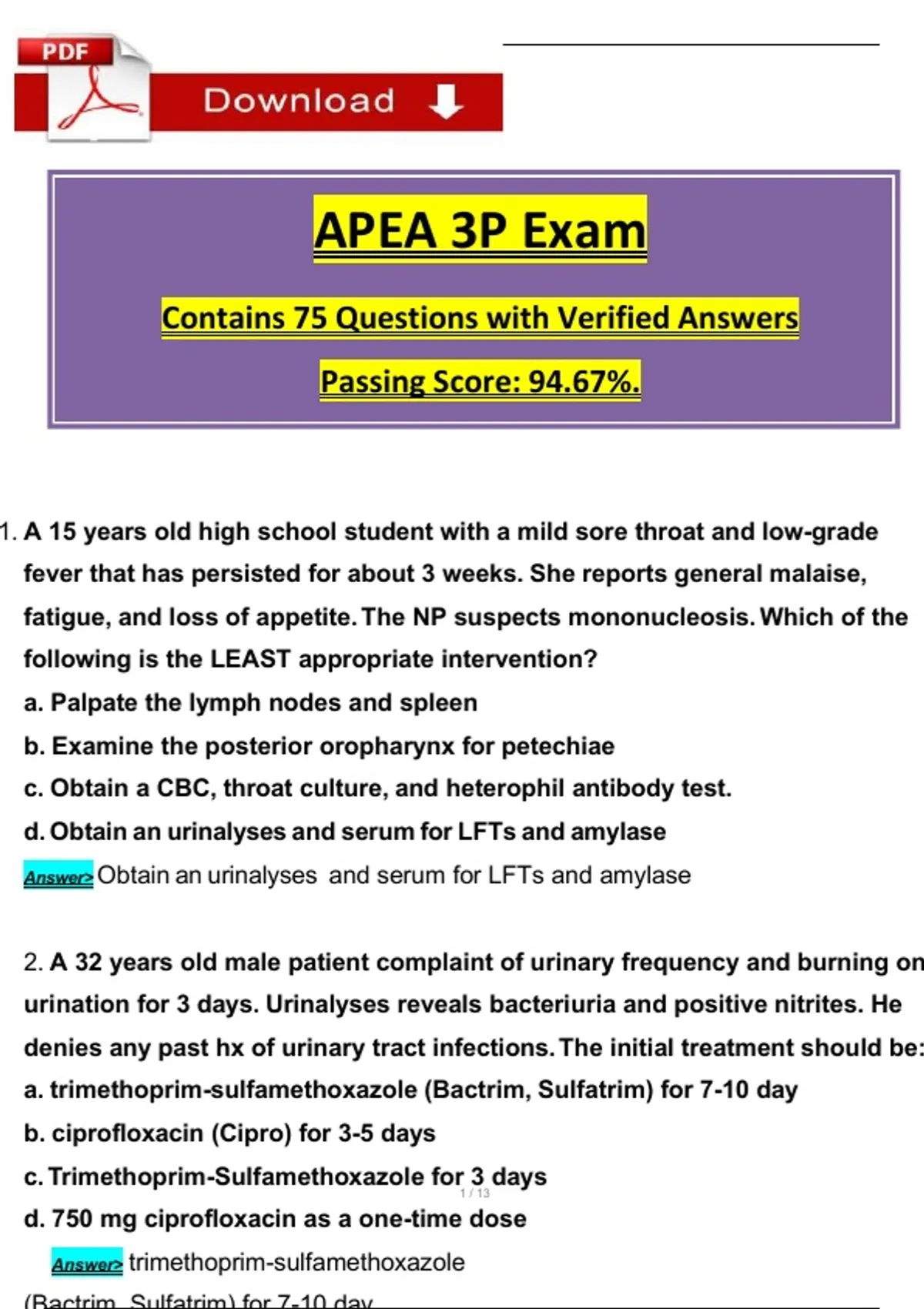 This document covers a complete set of 75 verified practice questions and answers designed to prepare students for the APEA 3P Exam. It reviews the essential clinical, diagnostic, and management concepts commonly assessed on the test. The material is structured to support efficient study and help learners meet the high passing score requirement of 94.67%.