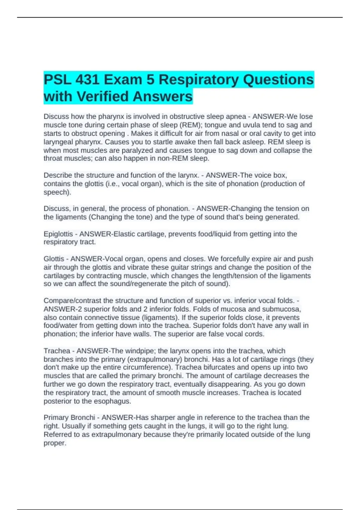PSL 431 Exam 5 Respiratory Questions with Verified Answers