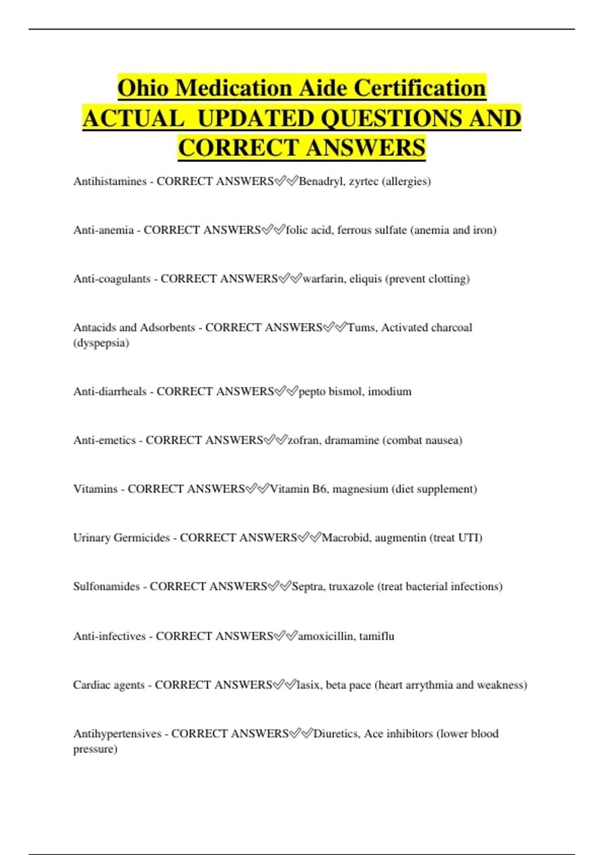 Anti-anemia - CORRECT ANSWERS✅✅folic acid, ferrous sulfate (anemia and iron)