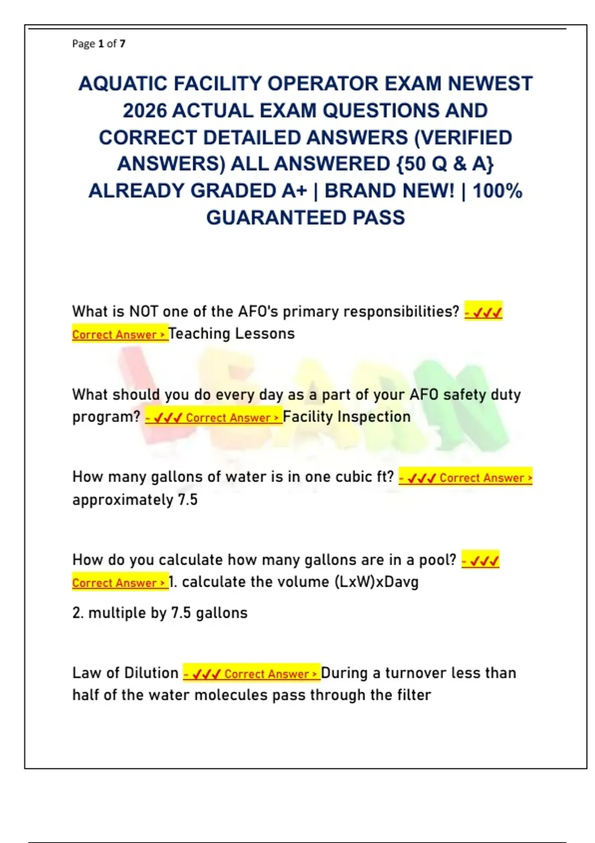 AQUATIC FACILITY OPERATOR EXAM NEWEST 2026 ACTUAL EXAM QUESTIONS AND CORRECT DETAILED ANSWERS (VERIFIED ANSWERS) ALL ANSWERED {50 Q & A} ALREADY GRADED A+ | BRAND NEW! | 100% GUARANTEED PASS