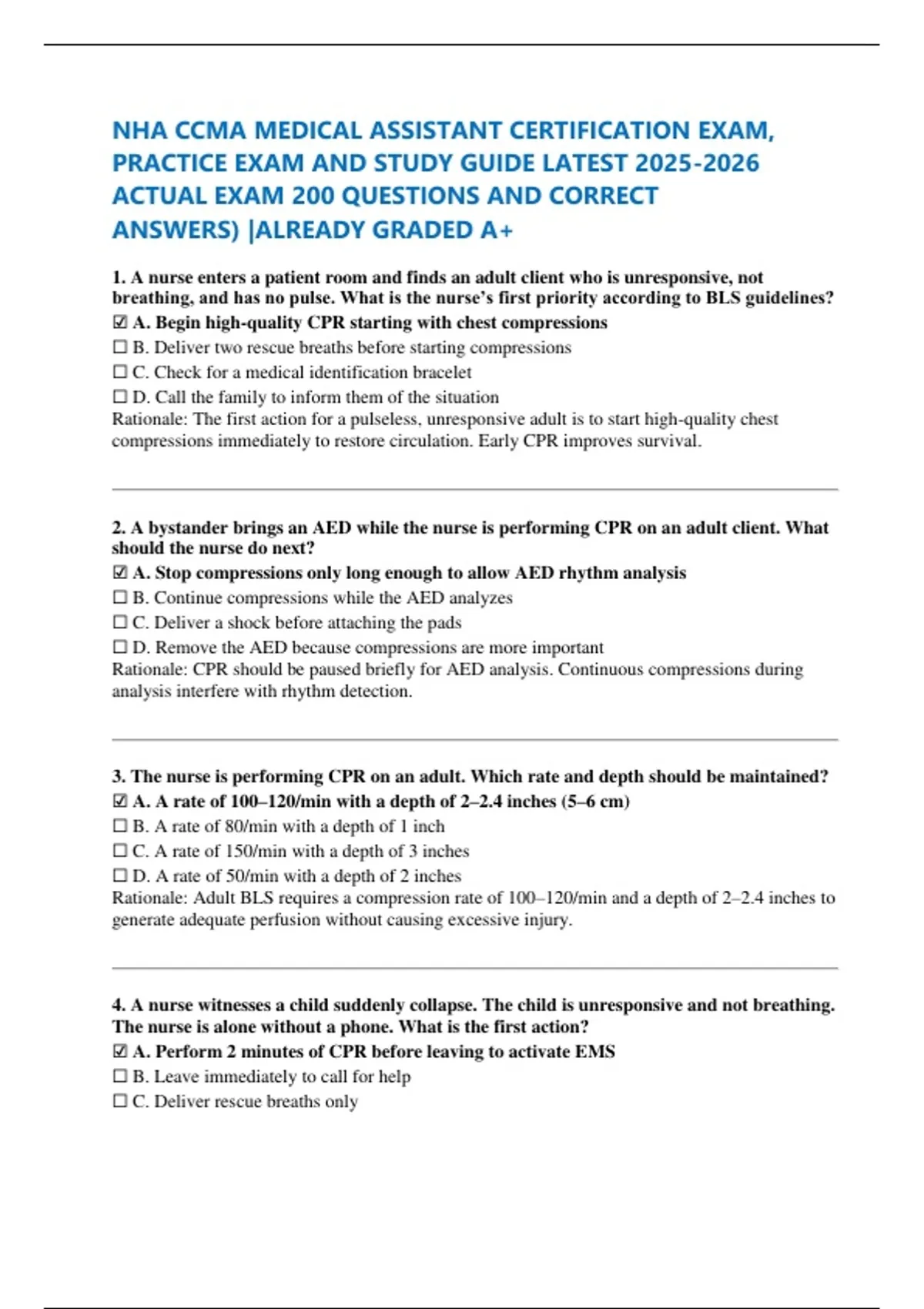 NHA CCMA MEDICAL ASSISTANT CERTIFICATION EXAM, PRACTICE EXAM AND STUDY GUIDE LATEST ACTUAL EXAM 200 QUESTIONS AND CORRECT ANSWERS) |ALREADY GRADED A+