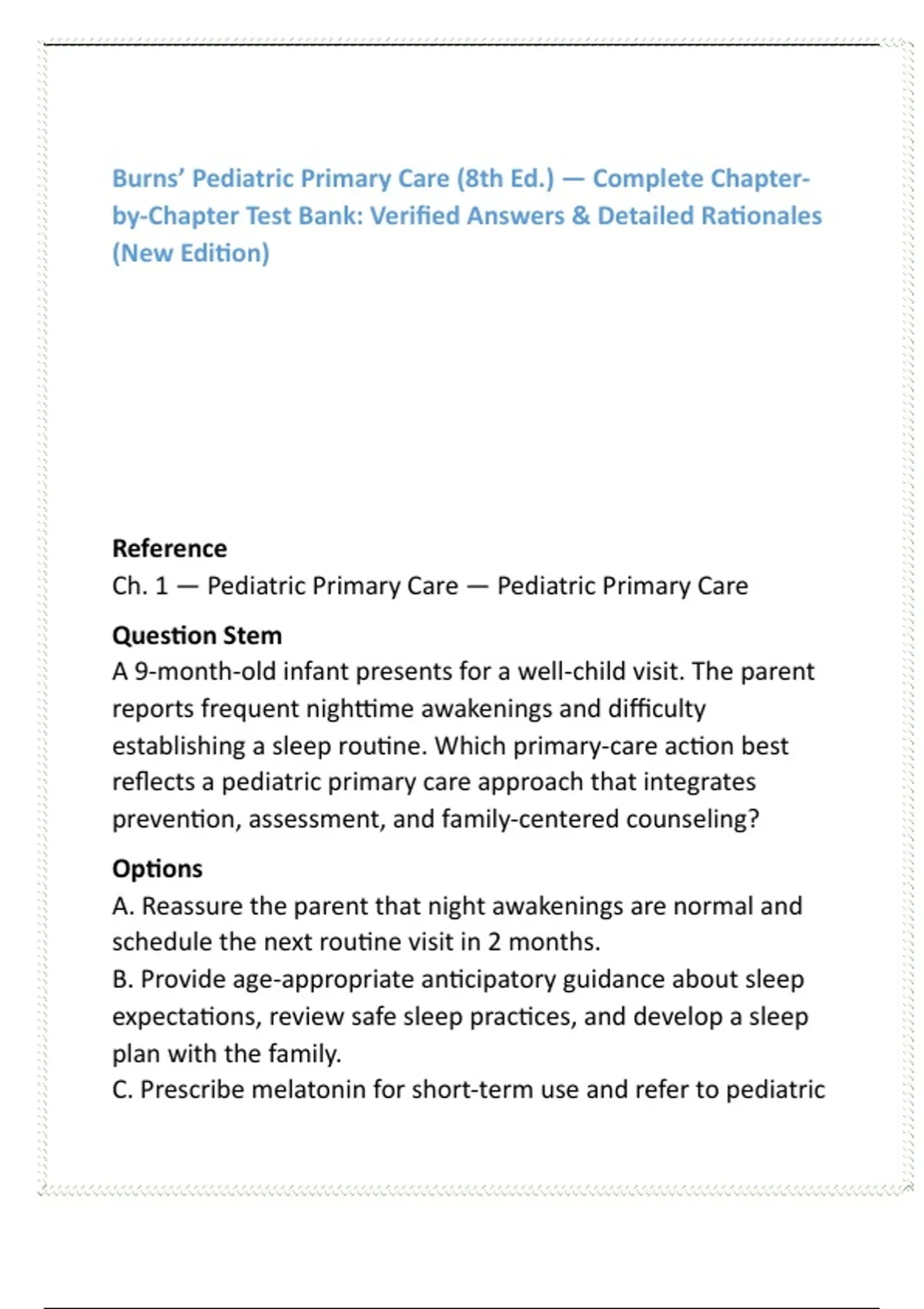 Burns’ Pediatric Primary Care Test Bank (8th Ed) – 20 MCQs/Chapter, NP Pediatrics Clinical Decision-Making & FNP/PNP Exam Prep 2) SEO Product Description (200–300 words) Boost your pediatric clinical mastery and accelerate your NP exam success with this comprehensive Burns’ Pediatric Primary Care (8th Edition) Test Bank—professionally crafted for FNP, PNP, and advanced pediatric learners who demand accuracy, depth, and real-world clinical relevance. This digital test bank delivers full-chapter coverage, featuring 20 high-quality, exam-style MCQs for every chapter of the Burns text. Each question is written to reflect authentic pediatric encounters—integrating assessment cues, developmental considerations, differential diagnosis, anticipatory guidance, management pathways, and evidence-based decision-making. Every item includes a verified correct answer supported by a clear, clinically grounded rationale to strengthen understanding and reinforce safe pediatric practice. Designed to save time and dramatically improve study efficiency, this test bank mirrors the analytical reasoning required for NP program exams, clinical rotations, and FNP/PNP certification boards. Students gain confidence applying pediatric primary care principles, from recognizing red flags to determining appropriate management, referrals, and follow-up. Ideal for independent study, course instructors, or NP programs seeking reliable assessment items, this resource empowers learners to master pediatric clinical judgment using one of the most respected texts in advanced practice education—Burns’ Pediatric Primary Care. Features include: • Full coverage of all chapters in Burns’ Pediatric Primary Care (8th Ed) • 20 clinically accurate MCQs per chapter • Detailed, evidence-based rationales for every answer • Realistic pediatric patient scenarios and differential-based reasoning • Perfect for FNP/PNP board prep, exams, quizzes, and clinical mastering • Instant-access digital study resource 3) 8 High-Value SEO Keywords pediatric primary care test bank Burns pediatric MCQs FNP pediatrics test bank PNP exam prep questions pediatric differential diagnosis practice NP clinical decision-making MCQs pediatric assessment study guide advanced practice pediatrics test bank 4) 10 Hashtags #PediatricPrimaryCare #NursePractitionerPrep #FNPExamPrep #PNPReview #NursingTestBank #ClinicalDecisionMaking #PediatricAssessment #NPStudentLife #StudyResource #NursingEducation