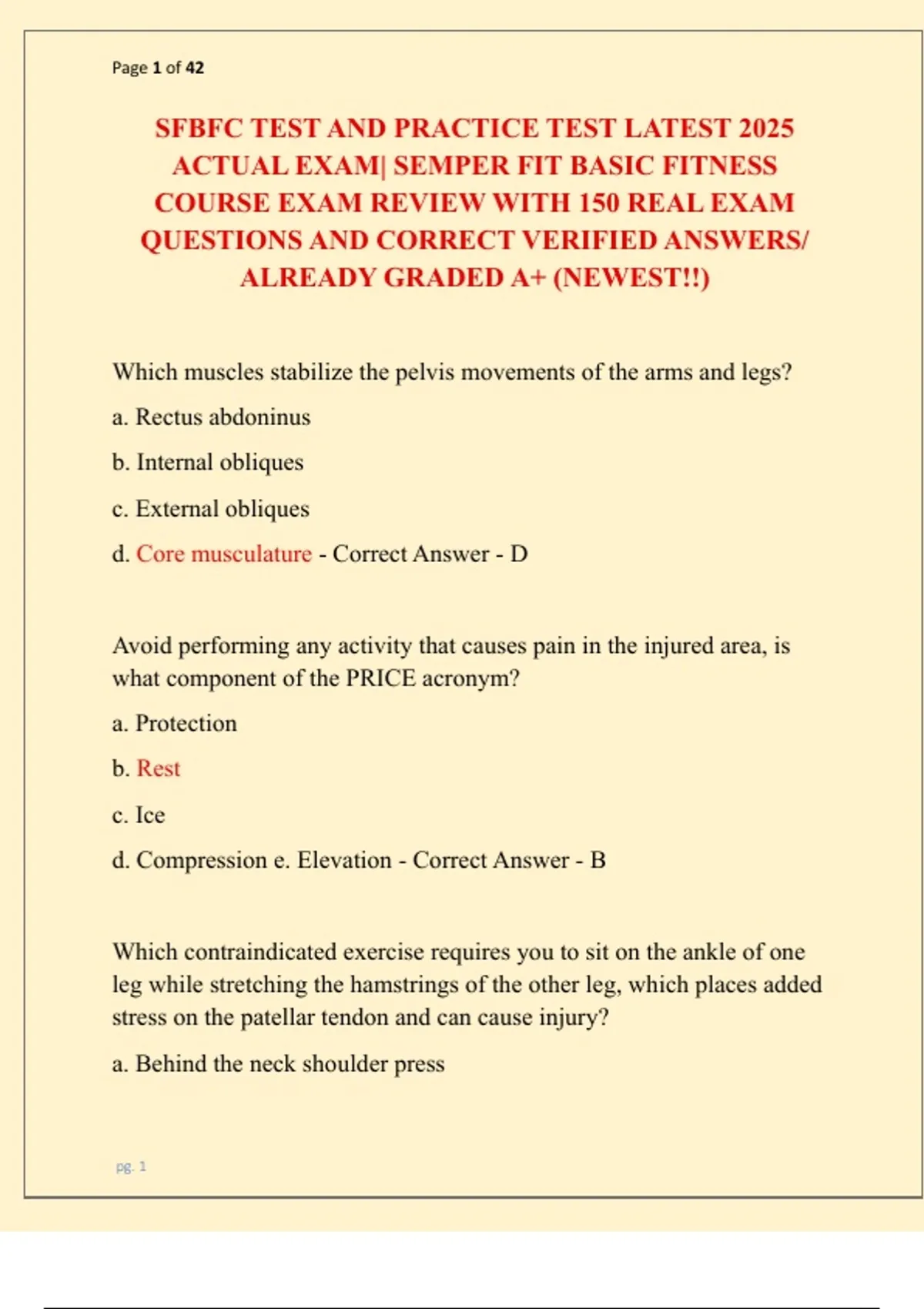 SFBFC TEST AND PRACTICE TEST LATEST 2025 ACTUAL EXAM| SEMPER FIT BASIC FITNESS COURSE EXAM REVIEW WITH 150 REAL EXAM QUESTIONS AND CORRECT VERIFIED ANSWERS/ ALREADY GRADED A+ (NEWEST!!)