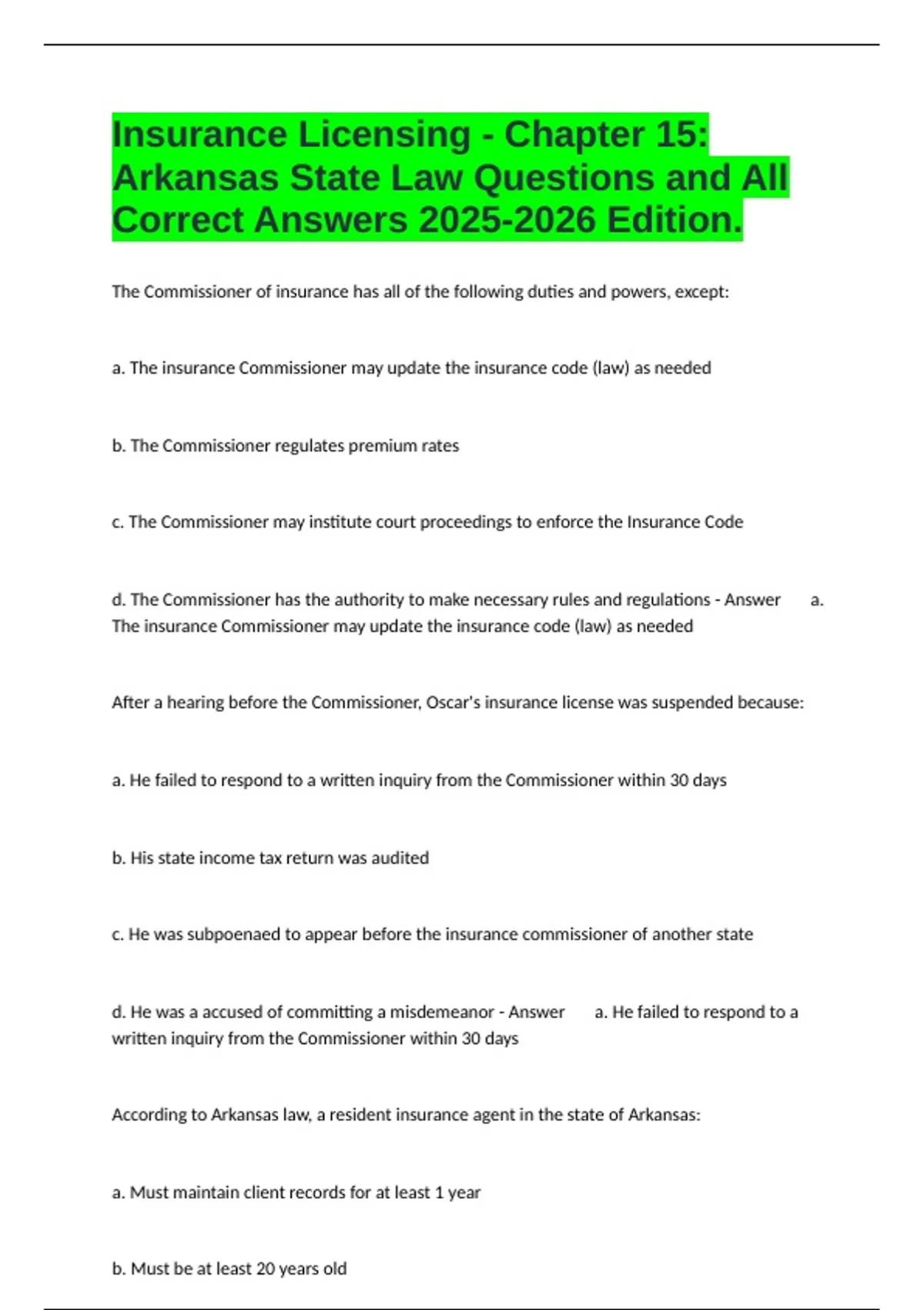 The Commissioner of insurance has all of the following duties and powers, except: a. The insurance Commissioner may update the insurance code (law) as needed b. The Commissioner regulates premium rates c. The Commissioner may institute court proceedings to enforce the Insurance Code d. The Commissioner has the authority to make necessary rules and regulations - Answer a. The insurance Commissioner may update the insurance code (law) as needed After a hearing before the Commissioner, Oscar's insurance license was suspended because: a. He failed to respond to a written inquiry from the Commissioner within 30 days b. His state income tax return was audited c. He was subpoenaed to appear before the insurance commissioner of another state d. He was a accused of committing a misdemeanor - Answer a. He failed to respond to a written inquiry from the Commissioner within 30 days According to Arkansas law, a resident insurance agent in the state of Arkansas: a. Must maintain client records for at least 1 year b. Must be at least 20 years old