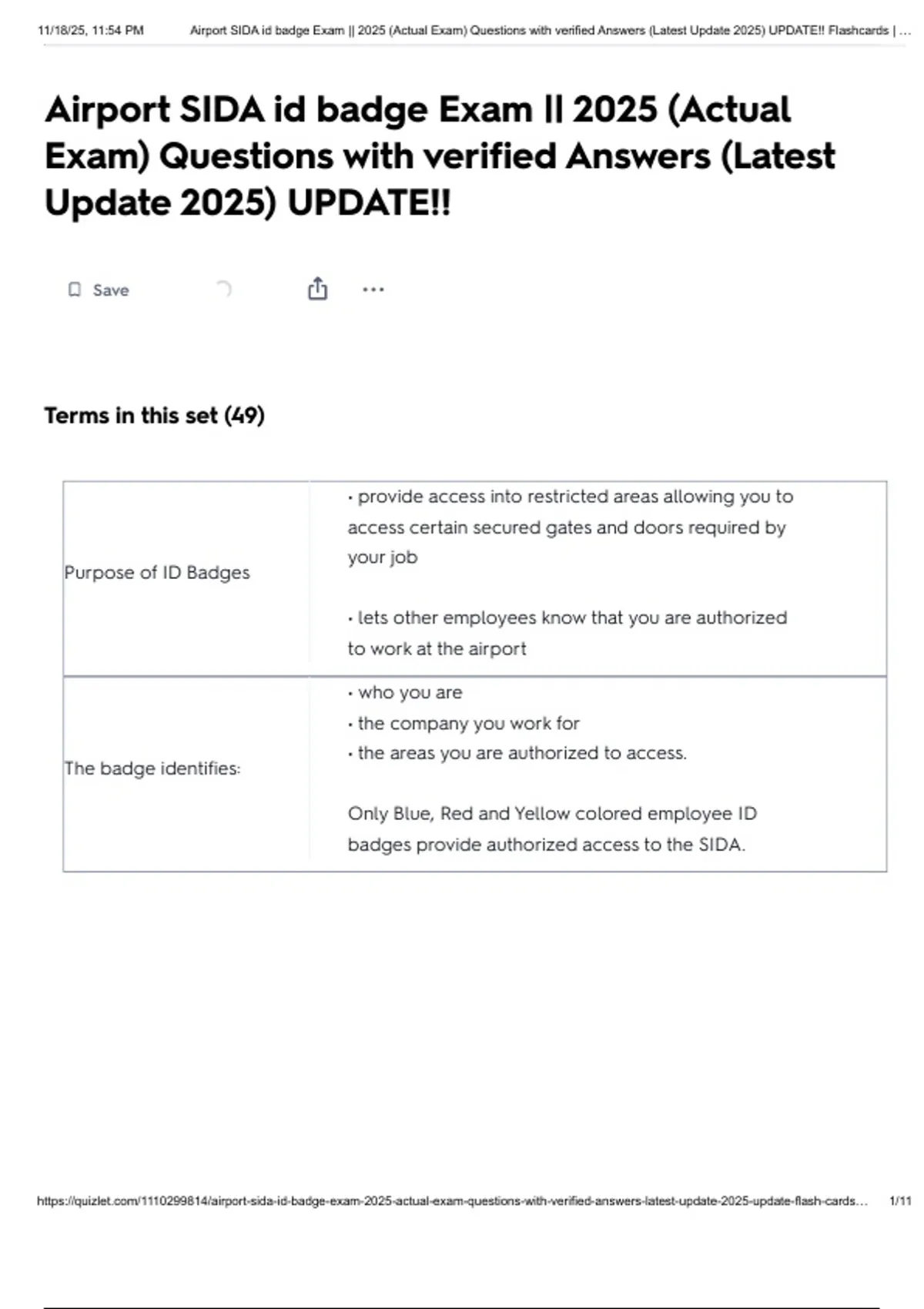 , 11/18/25, 11:54 PM Airport SIDA id badge Exam || 2025 (Actual Exam) Questions with verified Answers (Latest Update 2025) UPDATE!! Flashcards | …
