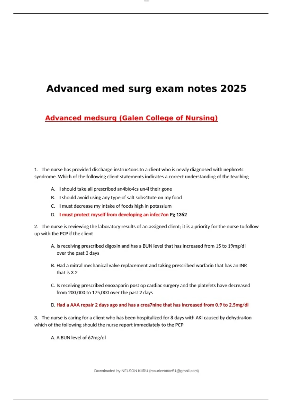 This document provides an extensive collection of advanced medical-surgical nursing exam questions and key clinical concepts relevant to the 2025 curriculum at Galen College of Nursing. It covers renal, hepatic, pancreatic, and cardiac disorders, including assessment findings, priority actions, lab interpretation, and discharge teaching. The material consists of scenario-based practice questions with answer cues, making it suitable for exam preparation and competency review.