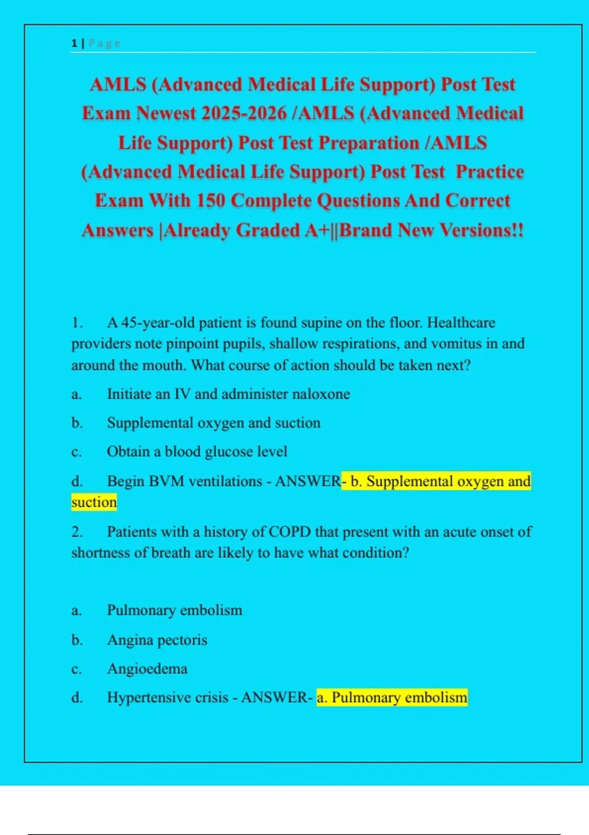 AMLS (Advanced Medical Life Support) Post Test Exam Newest /AMLS (Advanced Medical Life Support) Post Test Preparation /AMLS (Advanced Medical Life Support) Post Test Practice Exam With 150 Complete Questions And Correct Answers |Already Graded A+||Brand New Versions!!