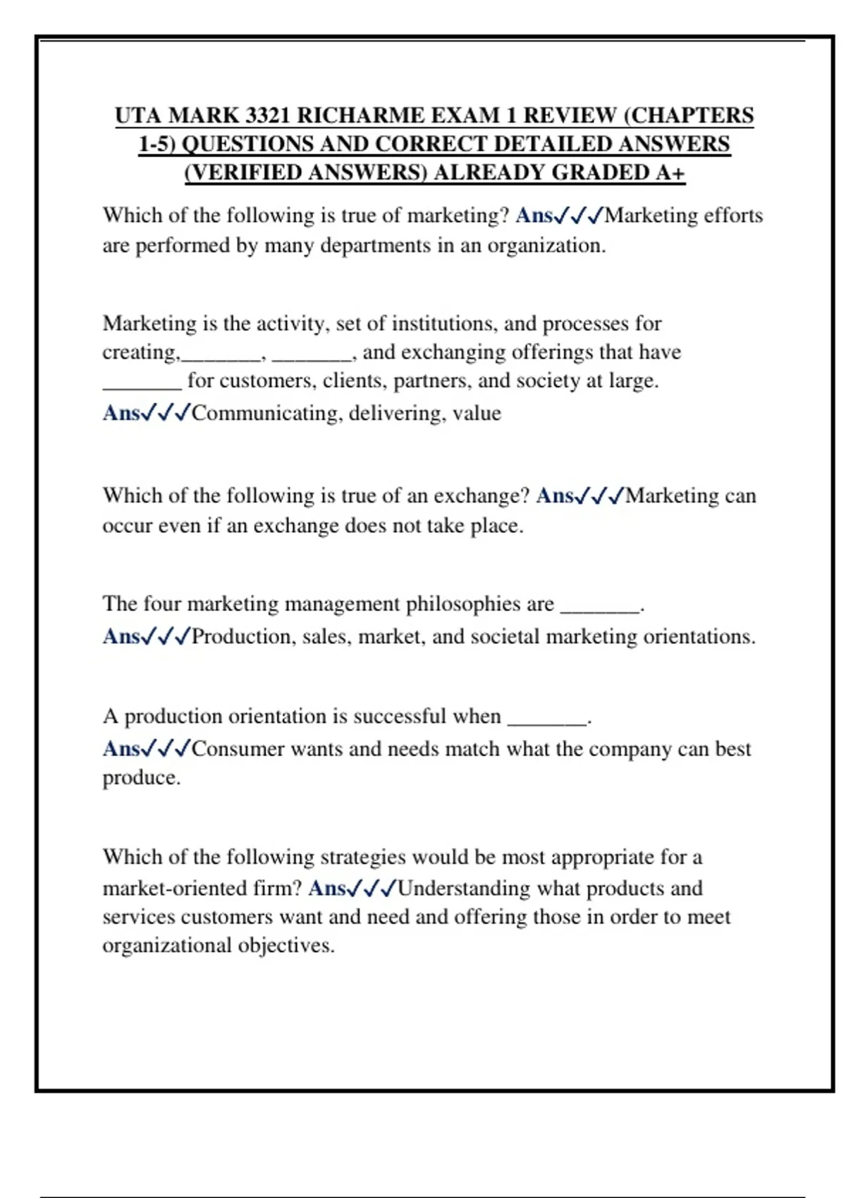 UTA MARK 3321 RICHARME EXAM 1 REVIEW (CHAPTERS 1-5) QUESTIONS AND CORRECT DETAILED ANSWERS (VERIFIED ANSWERS) ALREADY GRADED A+