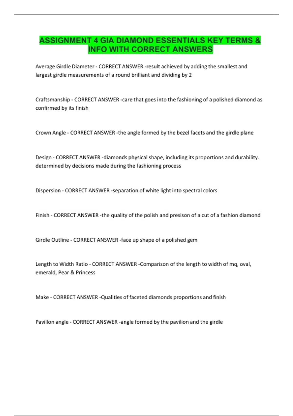 ASSIGNMENT 4 GIA DIAMOND ESSENTIALS KEY TERMS & INFO WITH CORRECT ANSWERS