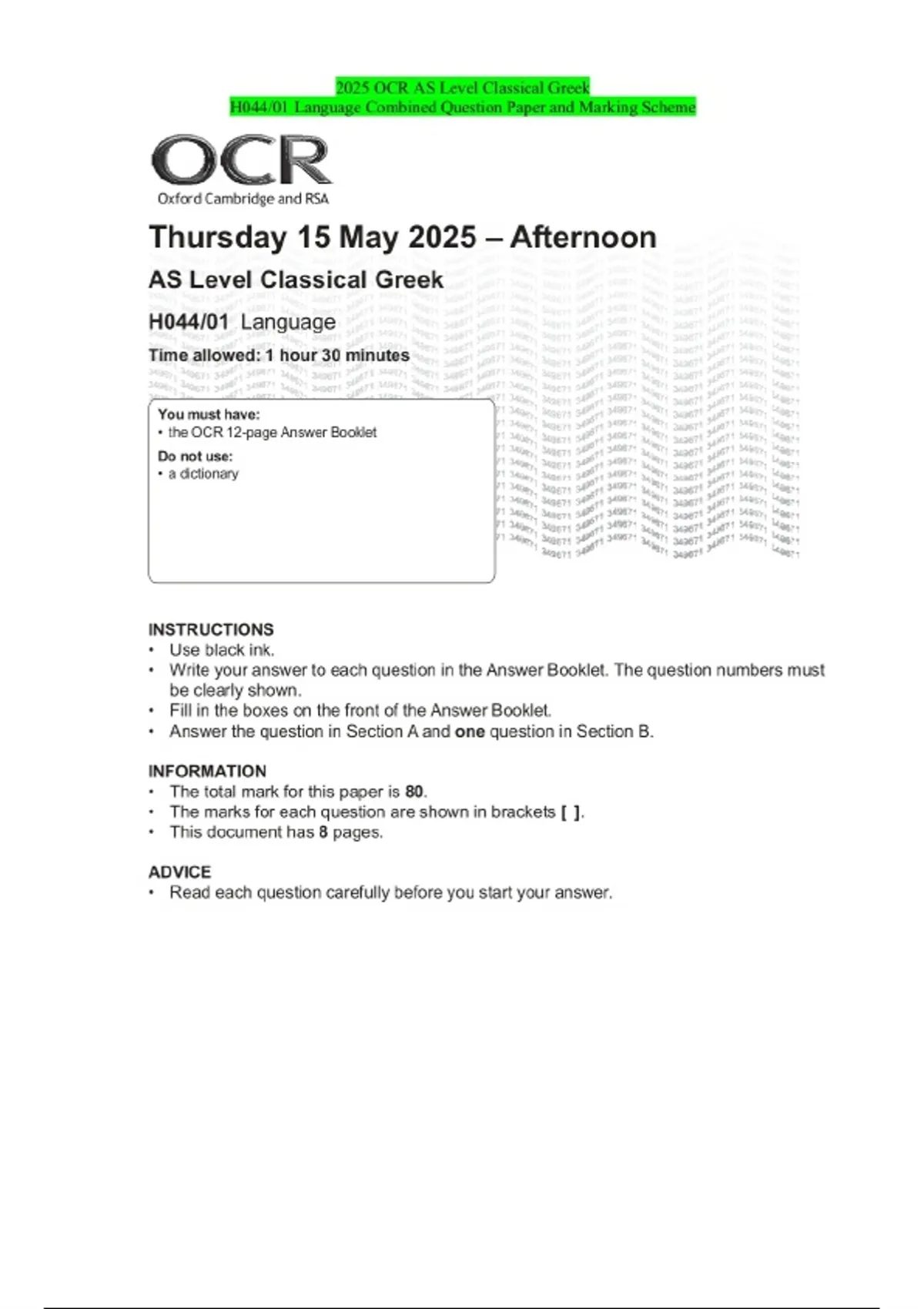 PACKAGE DEAL-::2025 OCR A Level|AS Level Classical Greek Exams|Combined Question Paper and Marking Scheme
