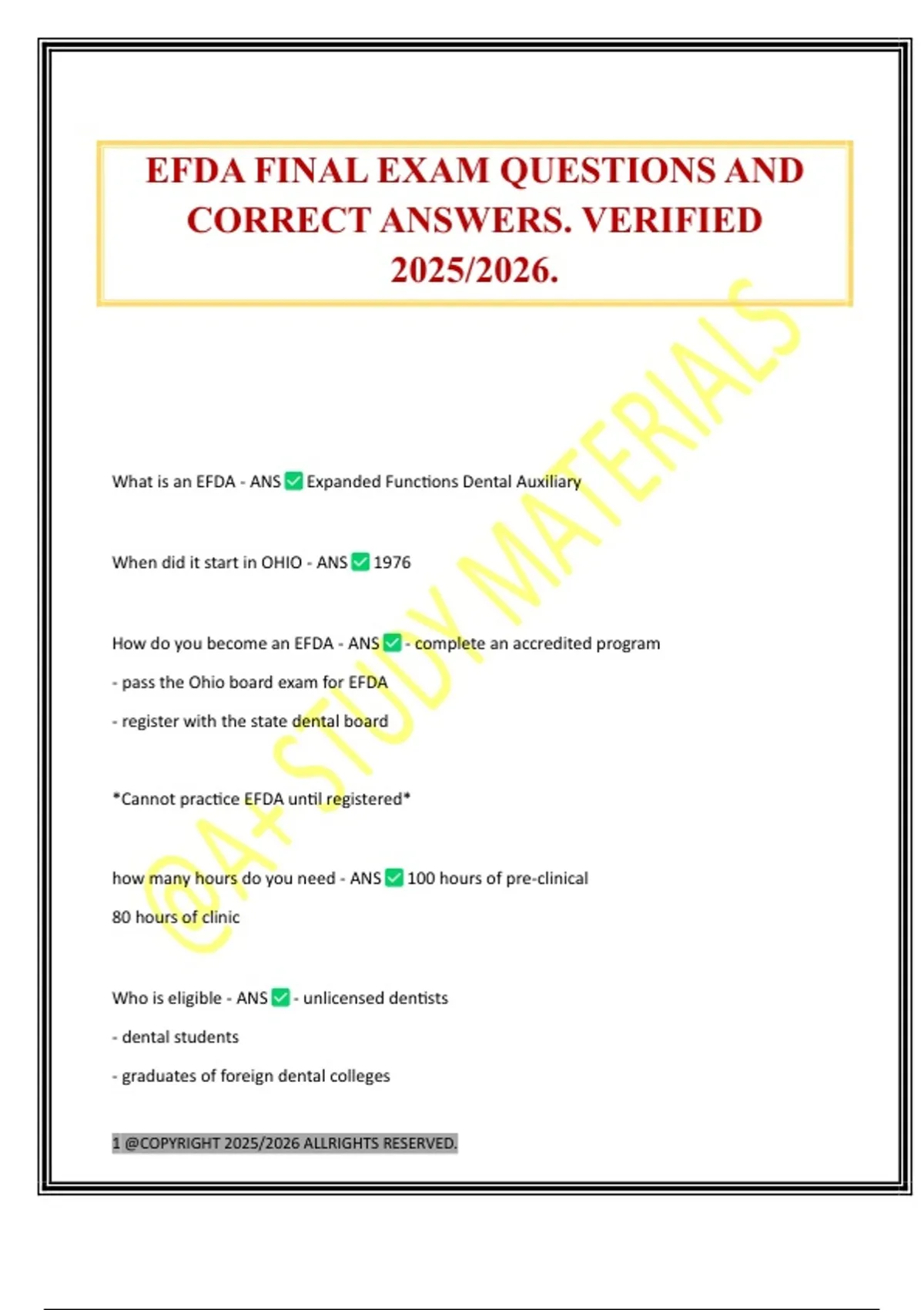 EFDA FINAL EXAM QUESTIONS AND CORRECT ANSWERS. VERIFIED 2025/2026.