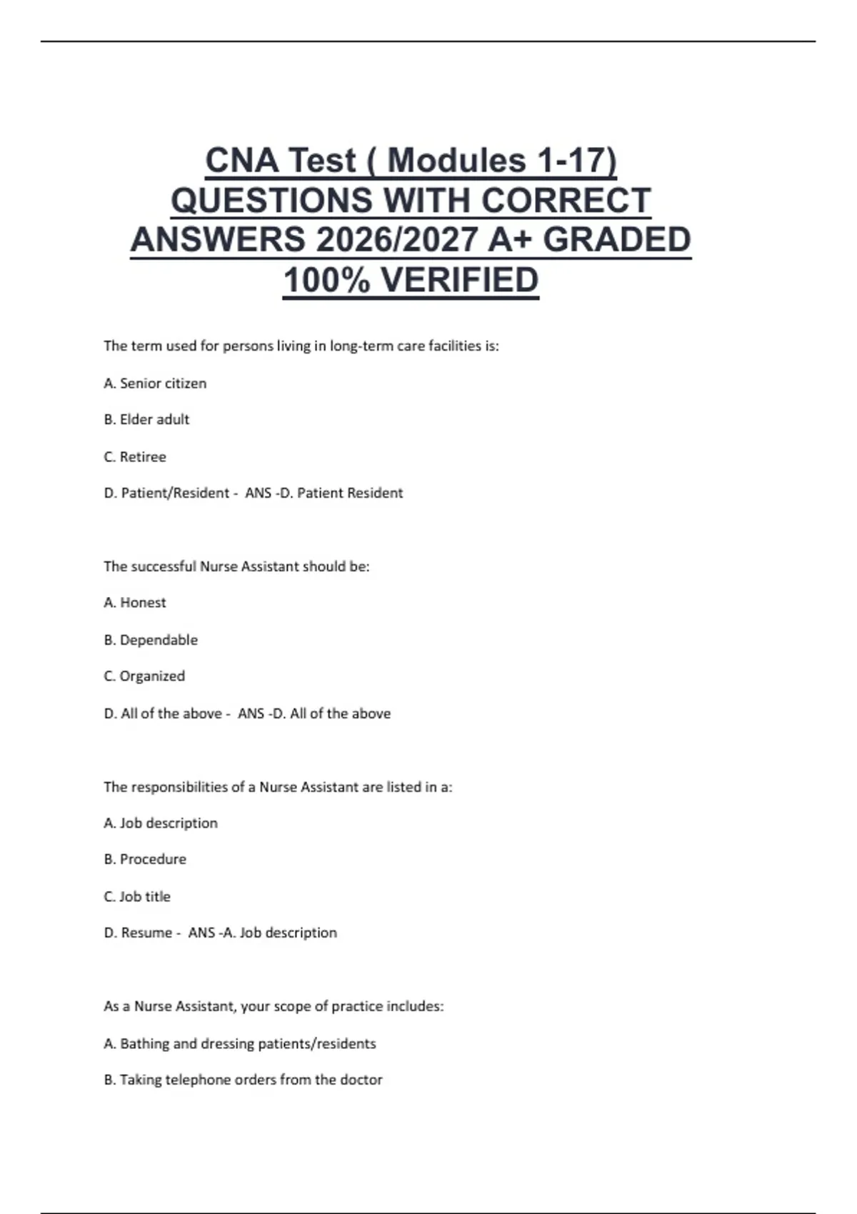 CNA Test ( Modules 1-17) QUESTIONS WITH CORRECT ANSWERS 2026/2027 A+ GRADED 100% VERIFIED