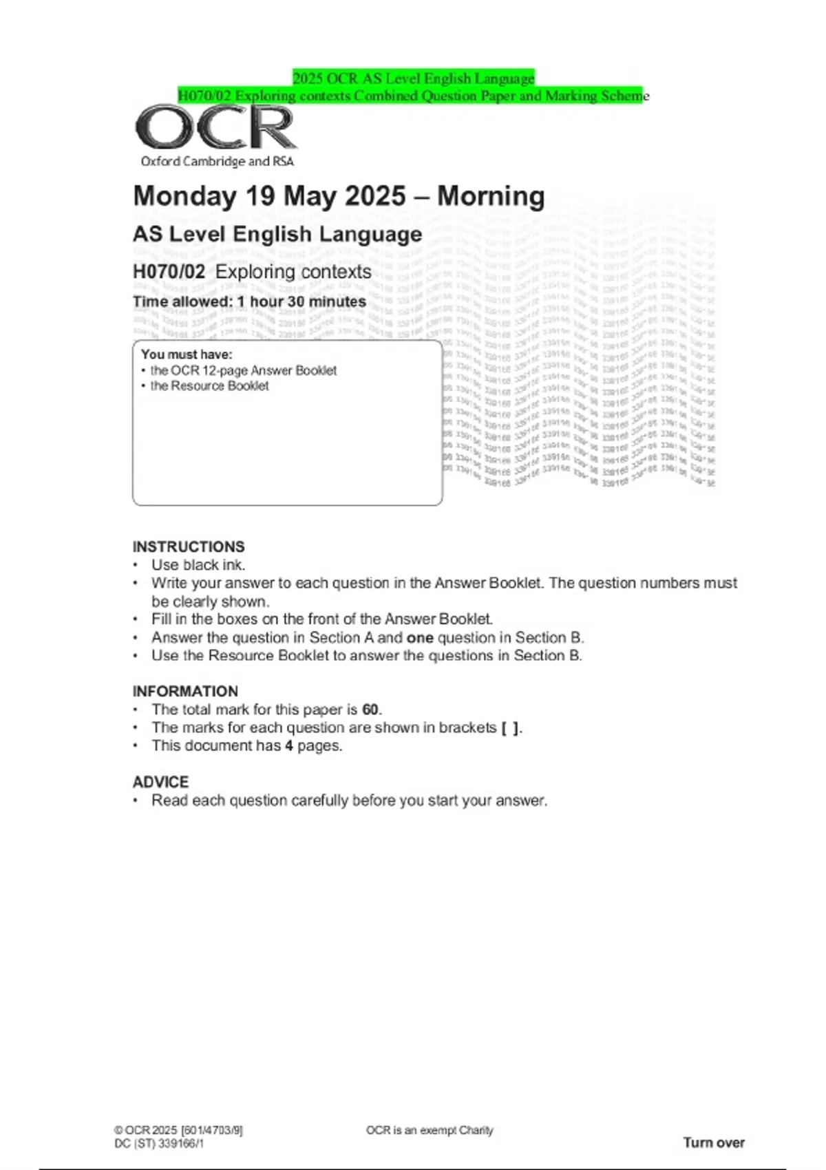 2025 OCR AS Level English Language H070/02 Exploring contexts Combined Question Paper and Marking Scheme