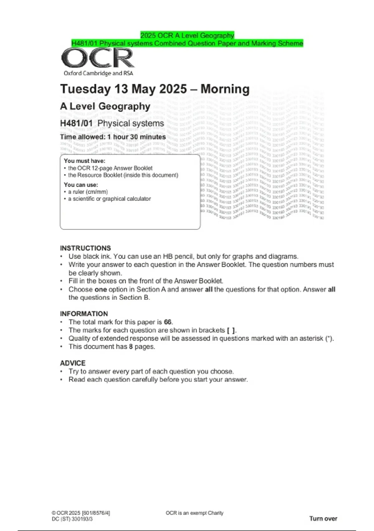 2025 OCR A Level Geography H481/01 Physical systems Combined Question Paper and Marking Scheme