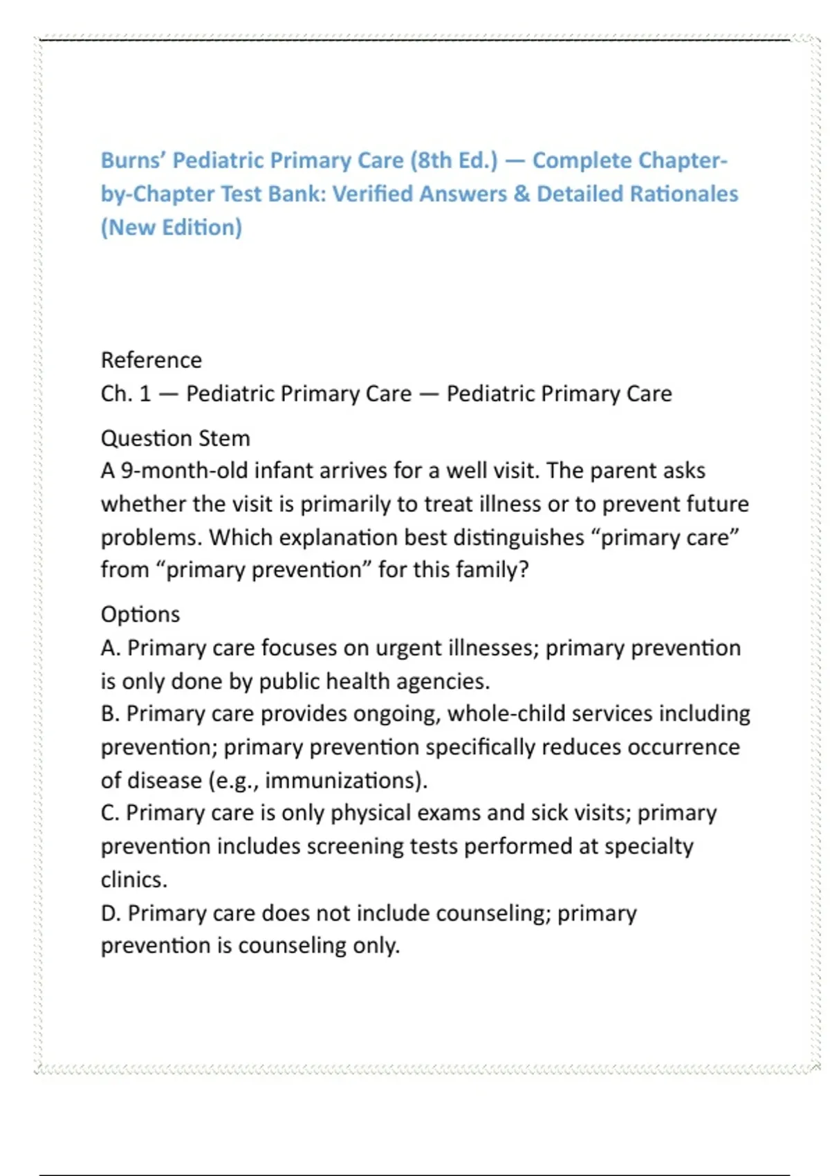 Pediatric Primary Care Test Bank | Burns 8th Ed | 20 MCQs/Chapter + Rationales | FNP & PNP Clinical Decision-Making Study Guide 2) SEO Product Description (200–300 words) Master pediatric assessment, diagnosis, and evidence-based management with this comprehensive Pediatric Primary Care Test Bank for Burns’ Pediatric Primary Care (8th Edition). Designed for NP students, PNP/FNP exam candidates, and pediatric clinical rotation learners, this digital test bank delivers the rigorous practice you need to build confidence and score higher on high-stakes exams. Each chapter of Burns’ leading text is covered in depth, featuring 20 clinically accurate, exam-style multiple-choice questions paired with clear, evidence-based rationales. Questions mirror the complexity and style of NP program exams, focusing on real-world pediatric encounters—from routine well-child care to complex chronic conditions. Scenarios challenge you to differentiate normal from abnormal findings, select accurate diagnoses, prioritize management plans, and apply advanced clinical reasoning across every developmental stage. Created to strengthen your diagnostic precision and reinforce core concepts, this test bank offers a structured, time-saving way to review pediatric primary care content while boosting your readiness for classroom exams and national board certification. Ideal for: FNP/PNP students, RN-to-NP learners, pediatric courses, clinical rotations, and NP faculty seeking high-quality assessment materials. Features Full coverage of Burns’ Pediatric Primary Care (8th Edition) 20 high-quality MCQs per chapter (ALL chapters included) Evidence-based rationales for every answer Pediatric assessment, differential diagnosis, and management scenarios Perfect for NP program exams, PNP/FNP boards, and clinical preparedness Instant, organized digital study resource Strengthen your clinical decision-making and become exam-ready with the most complete pediatric primary care test bank available. 3) 8 High-Value SEO Keywords pediatric primary care test bank Burns pediatric primary care 8th edition FNP pediatrics MCQs PNP board exam practice questions pediatric differential diagnosis review NP clinical decision-making test bank pediatric assessment study guide advanced practice pediatrics questions 4) 10 Hashtags #PediatricPrimaryCare #FNPprep #PNPprep #NursingEducation #TestBank #NursePractitionerStudent #PediatricsReview #BurnsPrimaryCare #ClinicalDecisionMaking #NPExamPrep