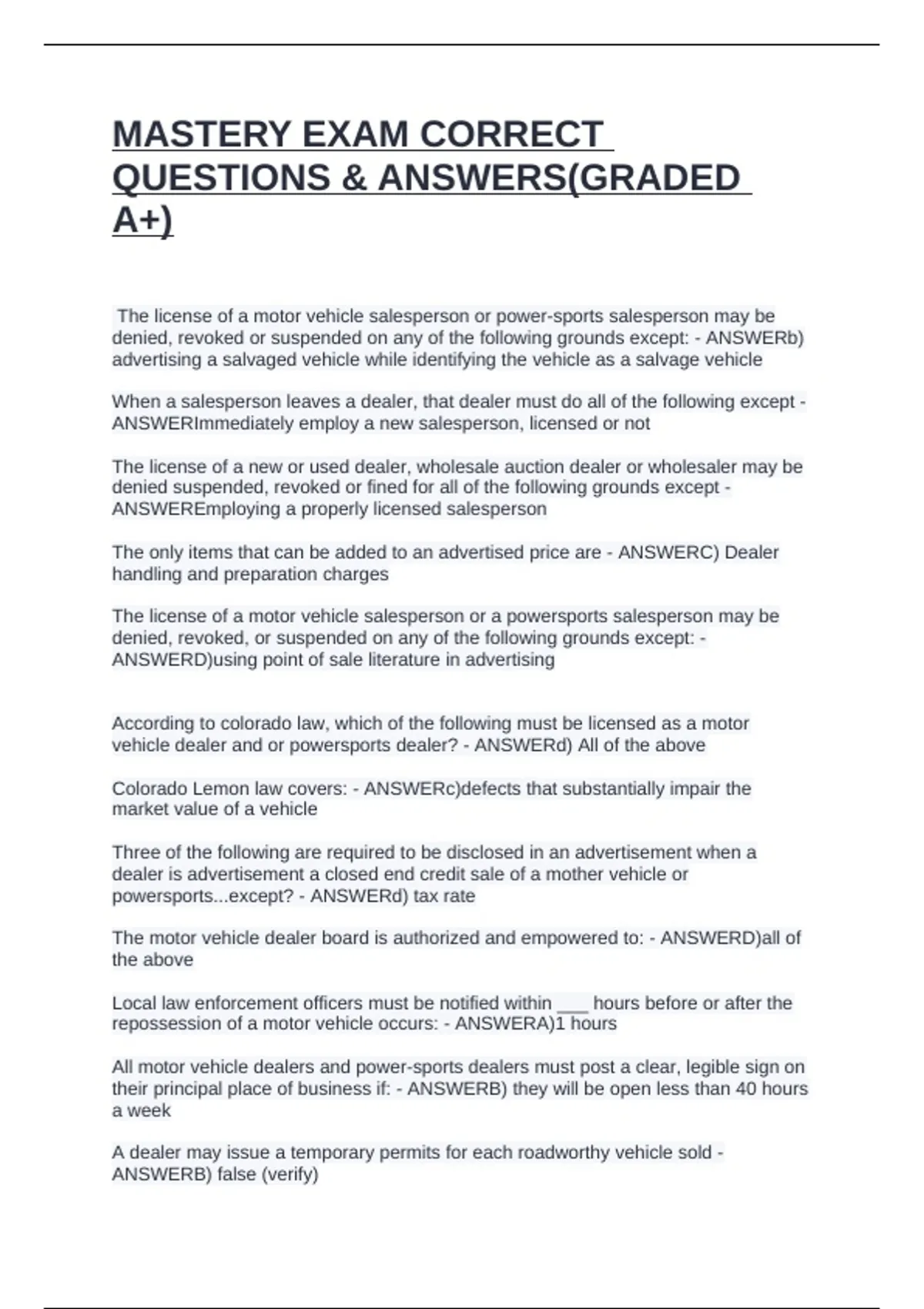 The license of a motor vehicle salesperson or power-sports salesperson may be denied, revoked or suspended on any of the following grounds except: - ANSWERb) advertising a salvaged vehicle while identifying the vehicle as a salvage vehicle When a salesperson leaves a dealer, that dealer must do all of the following except - ANSWERImmediately employ a new salesperson, licensed or not The license of a new or used dealer, wholesale auction dealer or wholesaler may be denied suspended, revoked or fined for all of the following grounds except - ANSWEREmploying a properly licensed salesperson The only items that can be added to an advertised price are - ANSWERC) Dealer handling and preparation charges The license of a motor vehicle salesperson or a powersports salesperson may be denied, revoked, or suspended on any of the following grounds except: - ANSWERD)using point of sale literature in advertising According to colorado law, which of the following must be licensed as a motor vehicle dealer and or powersports dealer? - ANSWERd) All of the above Colorado Lemon law covers: - ANSWERc)defects that substantially impair the market value of a vehicle Three of the following are required to be disclosed in an advertisement when a dealer is advertisement a closed end credit sale of a mother vehicle or powersports...except? - ANSWERd) tax rate The motor vehicle dealer board is authorized and empowered to: - ANSWERD)all of the above Local law enforcement officers must be notified within ___ hours before or after the repossession of a motor vehicle occurs: - ANSWERA)1 hours All motor vehicle dealers and power-sports dealers must post a clear, legible sign on their principal place of business if: - ANSWERB) they will be open less than 40 hours a week A dealer may issue a temporary permits for each roadworthy vehicle sold - ANSWERB) false (verify)