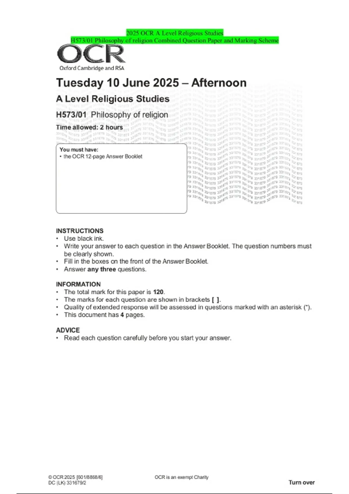 PACKAGE DEAL-::2025 OCR A Level|AS Level Religious Studies Exams|Combined Question Paper and Marking Scheme