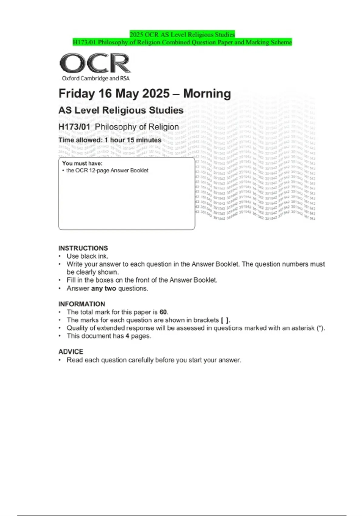 2025 OCR AS Level Religious Studies H173/01 Philosophy of Religion Combined Question Paper and Marking Scheme