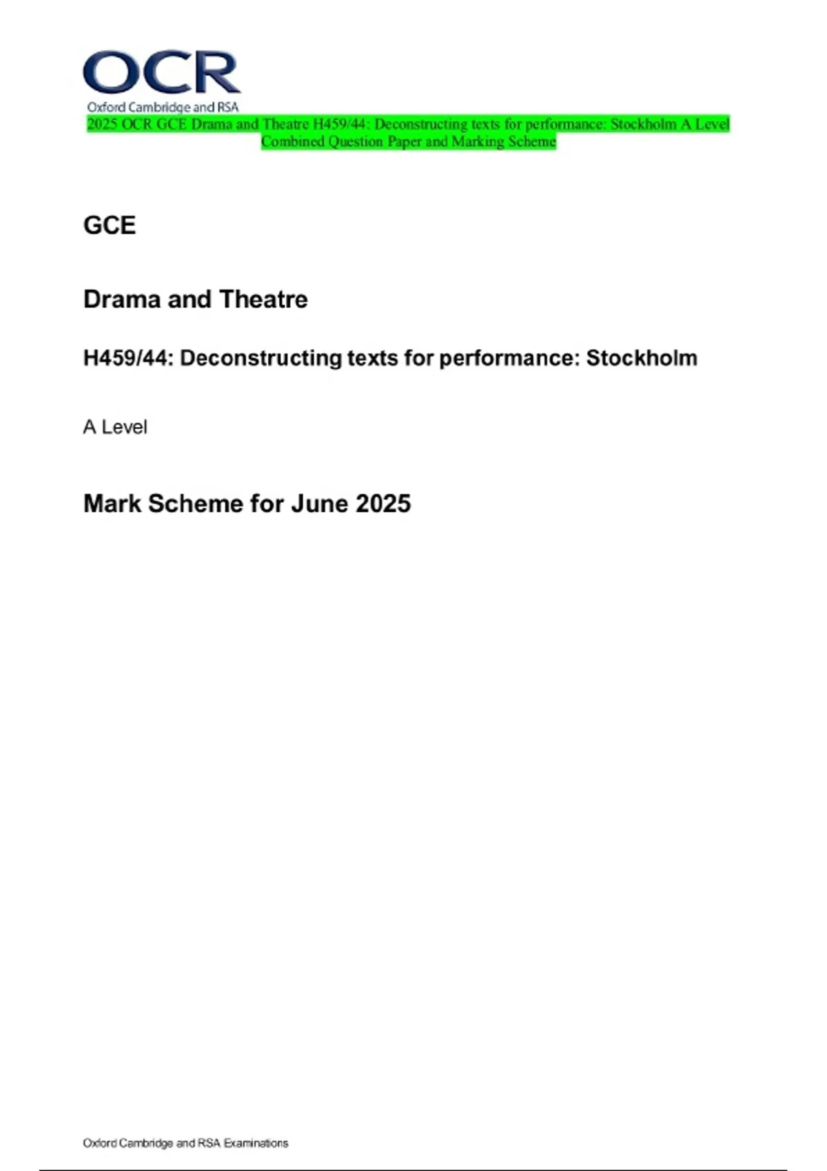 2025 OCR GCE Drama and Theatre H459/44: Deconstructing texts for performance: Stockholm A Level Combined Question Paper and Marking Scheme