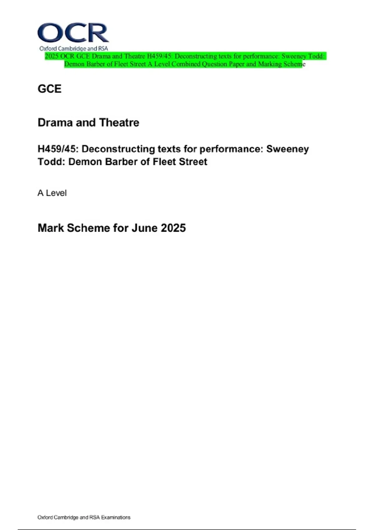 2025 OCR GCE Drama and Theatre H459/45: Deconstructing texts for performance: Sweeney Todd: Demon Barber of Fleet Street A Level Combined Question Paper and Marking Scheme