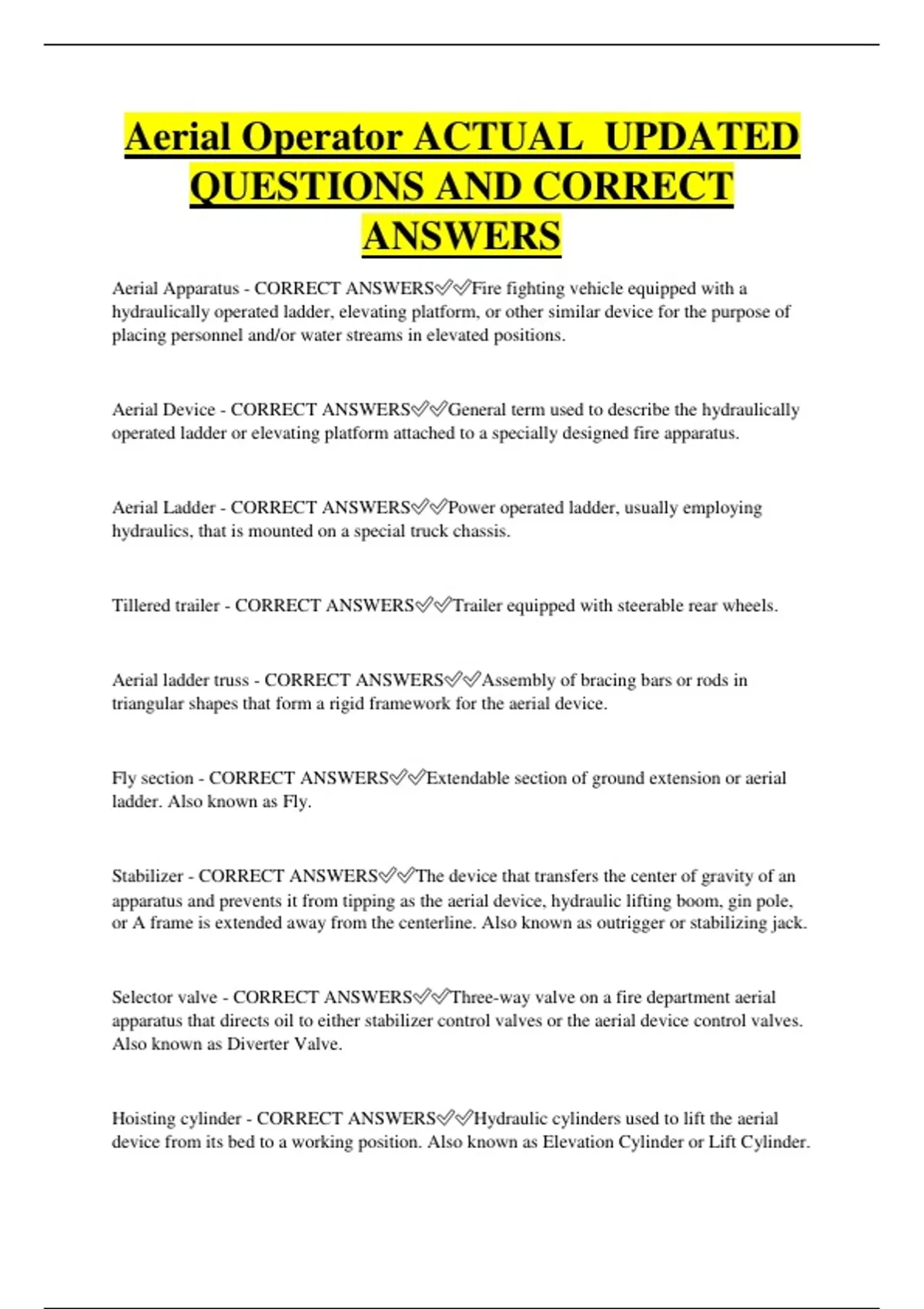 Aerial Operator ACTUAL UPDATED QUESTIONS AND CORRECT ANSWERS Aerial Apparatus - CORRECT ANSWERSFire fighting vehicle equipped with a hydraulically operated ladder, elevating platform, or other similar device for the purpose of placing personnel and/or water streams in elevated positions. Aerial Device - CORRECT ANSWERSGeneral term used to describe the hydraulically operated ladder or elevating platform attached to a specially designed fire apparatus. Aerial Ladder - CORRECT ANSWERSPower operated ladder, usually employing hydraulics, that is mounted on a special truck chassis. Tillered trailer - CORRECT ANSWERSTrailer equipped with steerable rear wheels. Aerial ladder truss - CORRECT ANSWERSAssembly of bracing bars or rods in triangular shapes that form a rigid framework for the aerial device. Fly section - CORRECT ANSWERSExtendable section of ground extension or aerial ladder. Also known as Fly. Stabilizer - CORRECT ANSWERSThe device that transfers the center of gravity of an apparatus and prevents it from tipping as the aerial device, hydraulic lifting boom, gin pole, or A frame is extended away from the centerline. Also known as outrigger or stabilizing jack. Selector valve - CORRECT ANSWERSThree-way valve on a fire department aerial apparatus that directs oil to either stabilizer control valves or the aerial device control valves. Also known as Diverter Valve. Hoisting cylinder - CORRECT ANSWERSHydraulic cylinders used to lift the aerial device from its bed to a working position. Also known as Elevation Cylinder or Lift Cylinde