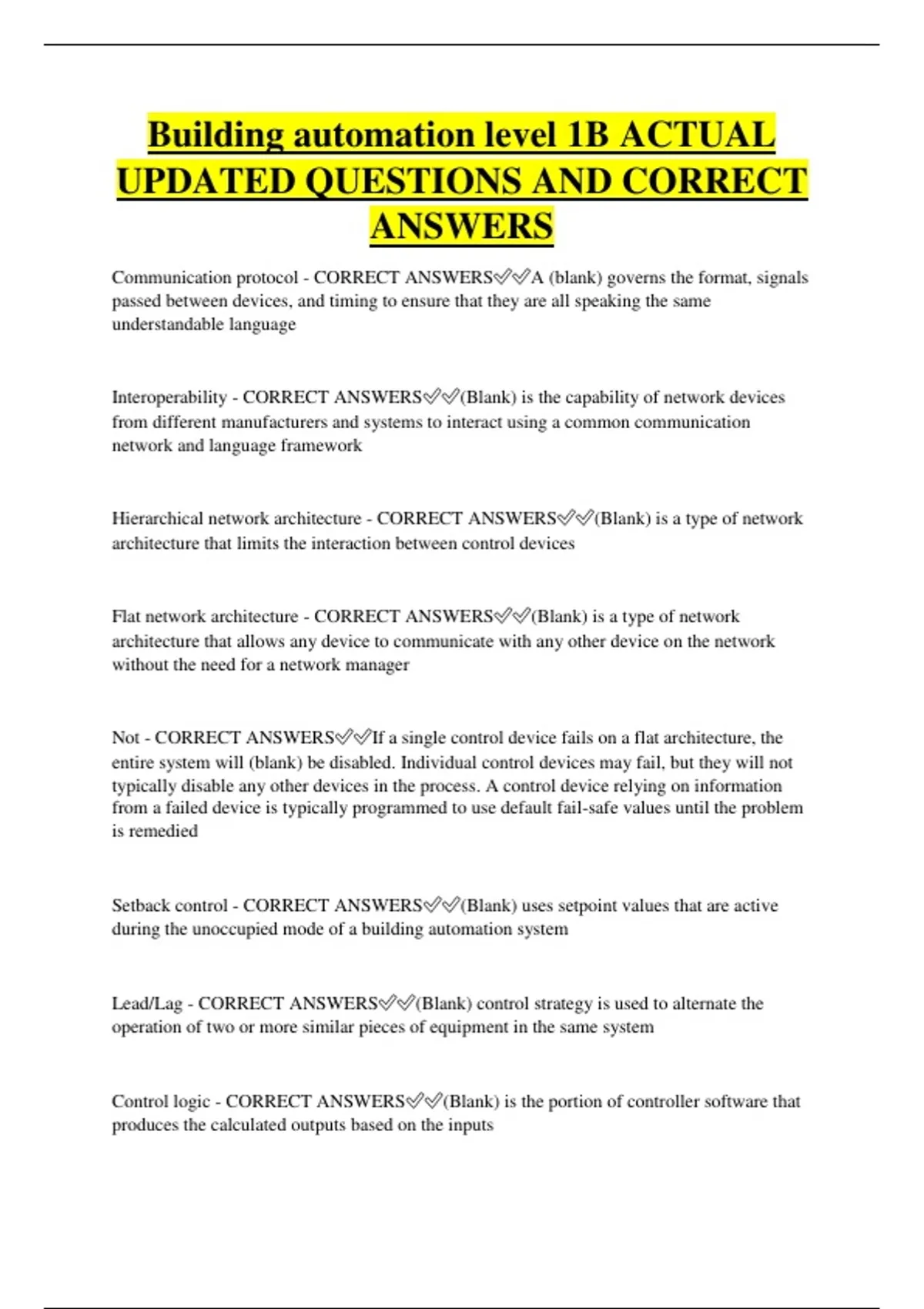 Building automation level 1B ACTUAL UPDATED QUESTIONS AND CORRECT ANSWERS Communication protocol - CORRECT ANSWERSA (blank) governs the format, signals passed between devices, and timing to ensure that they are all speaking the same understandable language Interoperability - CORRECT ANSWERS(Blank) is the capability of network devices from different manufacturers and systems to interact using a common communication network and language framework Hierarchical network architecture - CORRECT ANSWERS(Blank) is a type of network architecture that limits the interaction between control devices Flat network architecture - CORRECT ANSWERS(Blank) is a type of network architecture that allows any device to communicate with any other device on the network without the need for a network manager Not - CORRECT ANSWERSIf a single control device fails on a flat architecture, the entire system will (blank) be disabled. Individual control devices may fail, but they will not typically disable any other devices in the process. A control device relying on information from a failed device is typically programmed to use default fail-safe values until the problem is remedied Setback control - CORRECT ANSWERS(Blank) uses setpoint values that are active during the unoccupied mode of a building automation system Lead/Lag - CORRECT ANSWERS(Blank) control strategy is used to alternate the operation of two or more similar pieces of equipment in the same system Control logic - CORRECT ANSWERS(Blank) is the portion of controller software t