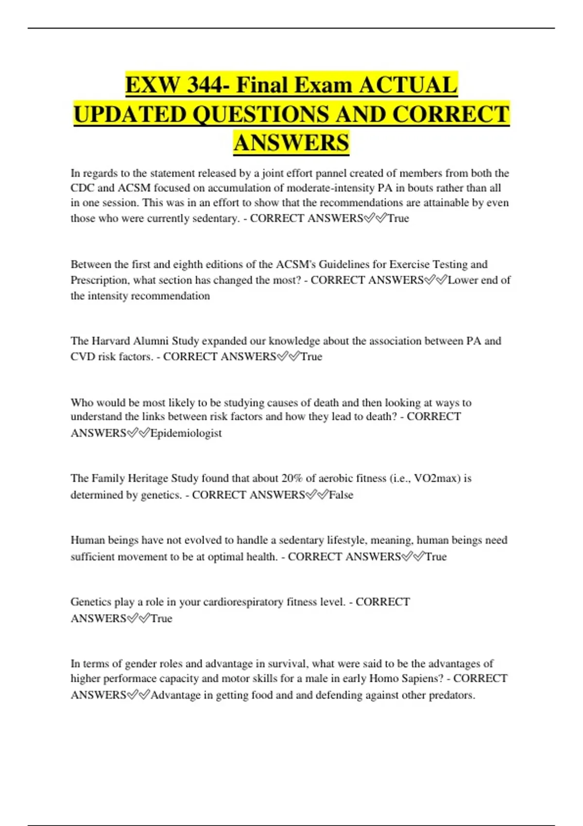 EXW 344- Final Exam ACTUAL UPDATED QUESTIONS AND CORRECT ANSWERS In regards to the statement released by a joint effort pannel created of members from both the CDC and ACSM focused on accumulation of moderate-intensity PA in bouts rather than all in one session. This was in an effort to show that the recommendations are attainable by even those who were currently sedentary. - CORRECT ANSWERSTrue Between the first and eighth editions of the ACSM's Guidelines for Exercise Testing and Prescription, what section has changed the most? - CORRECT ANSWERSLower end of the intensity recommendation The Harvard Alumni Study expanded our knowledge about the association between PA and CVD risk factors. - CORRECT ANSWERSTrue Who would be most likely to be studying causes of death and then looking at ways to understand the links between risk factors and how they lead to death? - CORRECT ANSWERSEpidemiologist The Family Heritage Study found that about 20% of aerobic fitness (i.e., VO2max) is determined by genetics. - CORRECT ANSWERSFalse Human beings have not evolved to handle a sedentary lifestyle, meaning, human beings need sufficient movement to be at optimal health. - CORRECT ANSWERSTrue Genetics play a role in your cardiorespiratory fitness level. - CORRECT ANSWERSTrue In terms of gender roles and advantage in survival, what were said to be the advantages of higher performace capacity and motor skills for a male in early Homo Sapiens? - CORRECT ANSWERSAdvantage in getting food and and defending against other predators. When looking at physical inactivity as a risk factor, the term "hypokinetic diseases" was a previously used term about 50 years ago. Based on the informaiton discussed in the text, what does this term mean? - CORRECT ANSWERSDue too decreased or less movement Chronic diseases contributed to over half of the deaths reported worldwide in 2004. - CORRECT ANSWERSTrue Which of these is proposed within Ch.1 to be the biggest paradox of the evoloutionary history of homo sapiens? - CORRECT ANSWERSThat human beings are better off when we maintain a physically active lifestyle but we are always looking for ways to decrease the need for muscular work and physical exertion. The skeletal structure of homo sapiens, with short femoral necks, stabilized foot arch, short toes, and large hip and knee joints, is well adapt for long distance running. - CORRECT