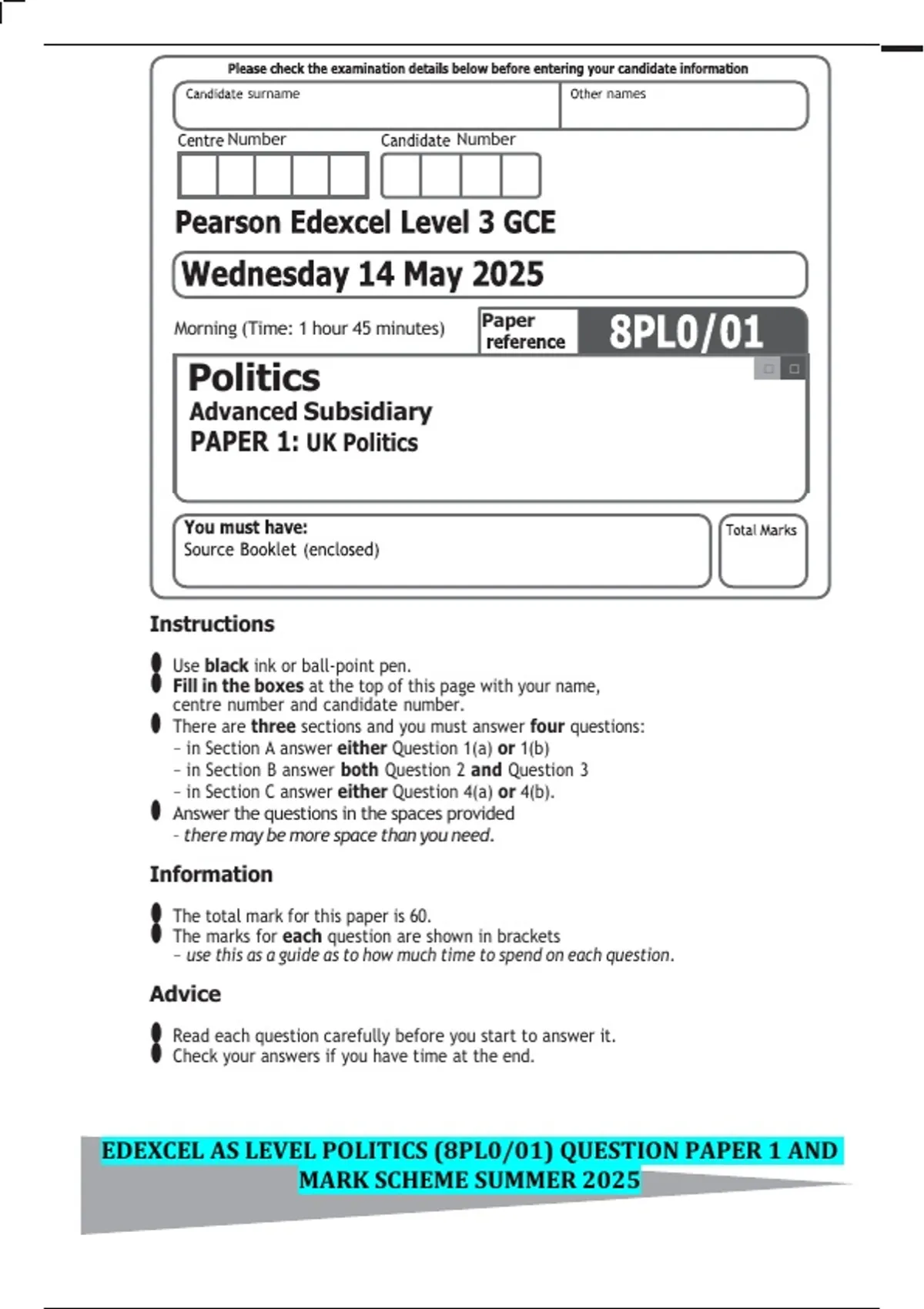 EDEXCEL AS LEVEL POLITICS (8PL0/01) QUESTION PAPER 1 AND MARK SCHEME SUMMER 2025
