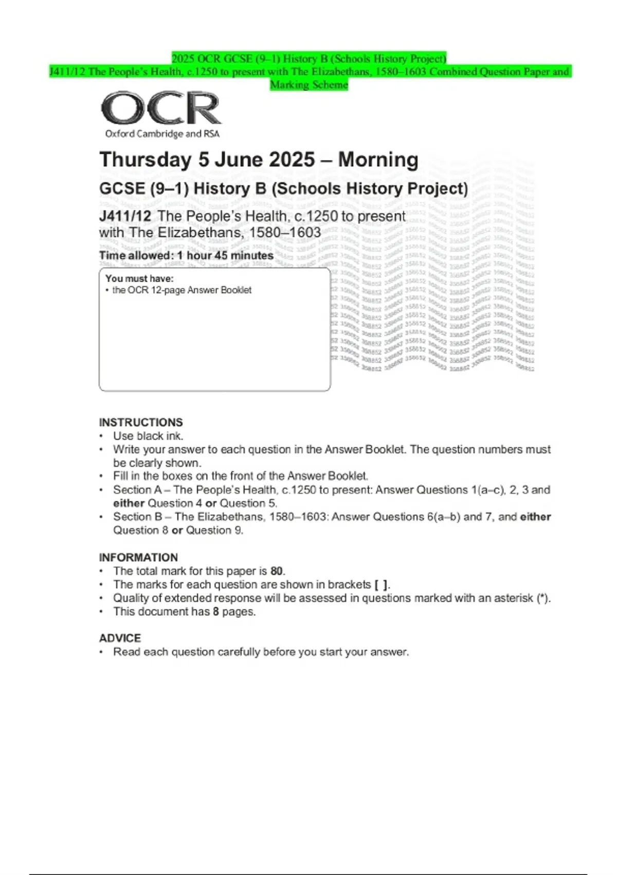 2025 OCR GCSE (9–1) History B (Schools History Project) J411/12 The People’s Health, c.1250 to present with The Elizabethans, 1580–1603 Combined Question Paper and Marking Scheme