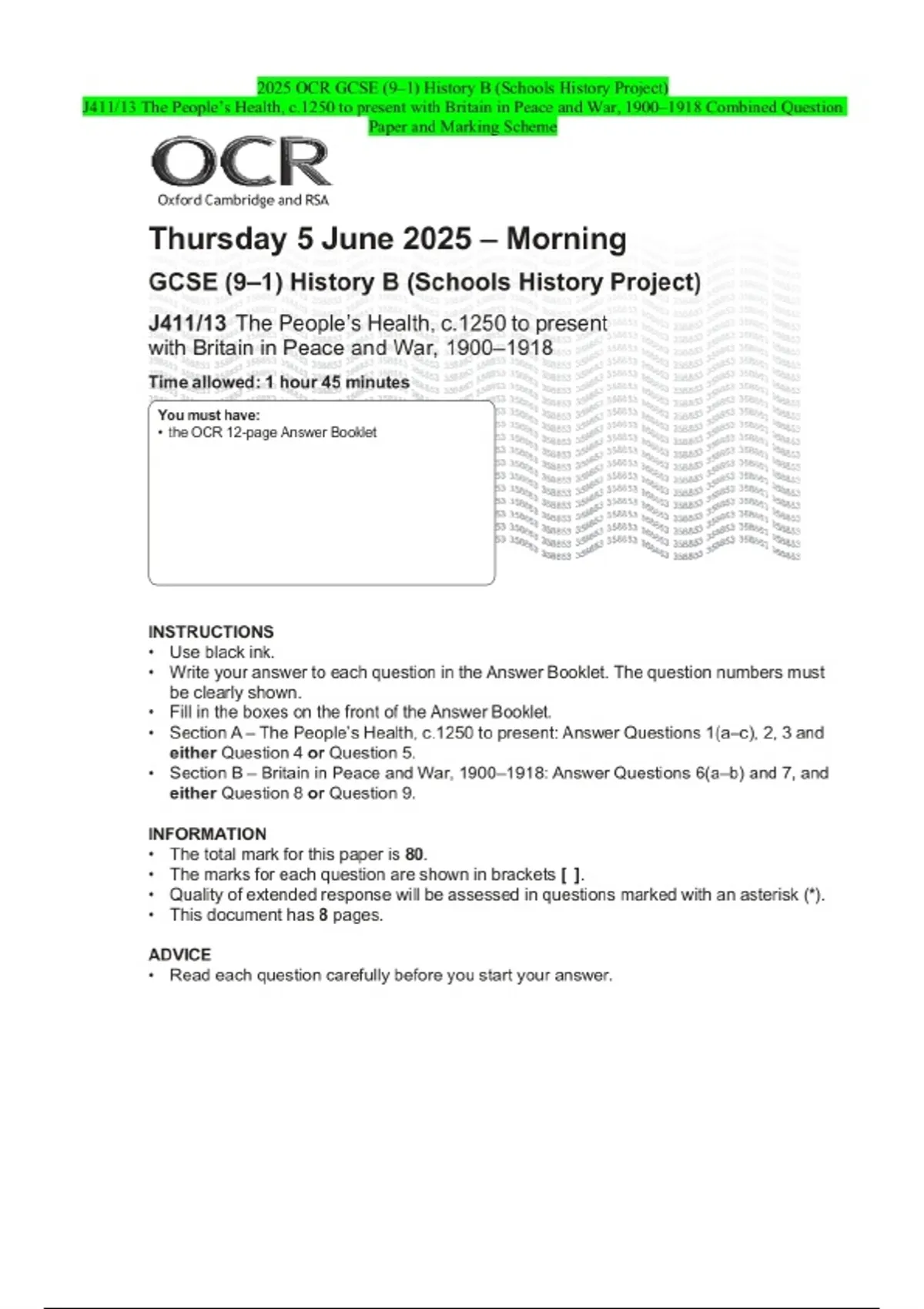 2025 OCR GCSE (9–1) History B (Schools History Project) J411/13 The People’s Health, c.1250 to present with Britain in Peace and War, 1900–1918 Combined Question Paper and Marking Scheme