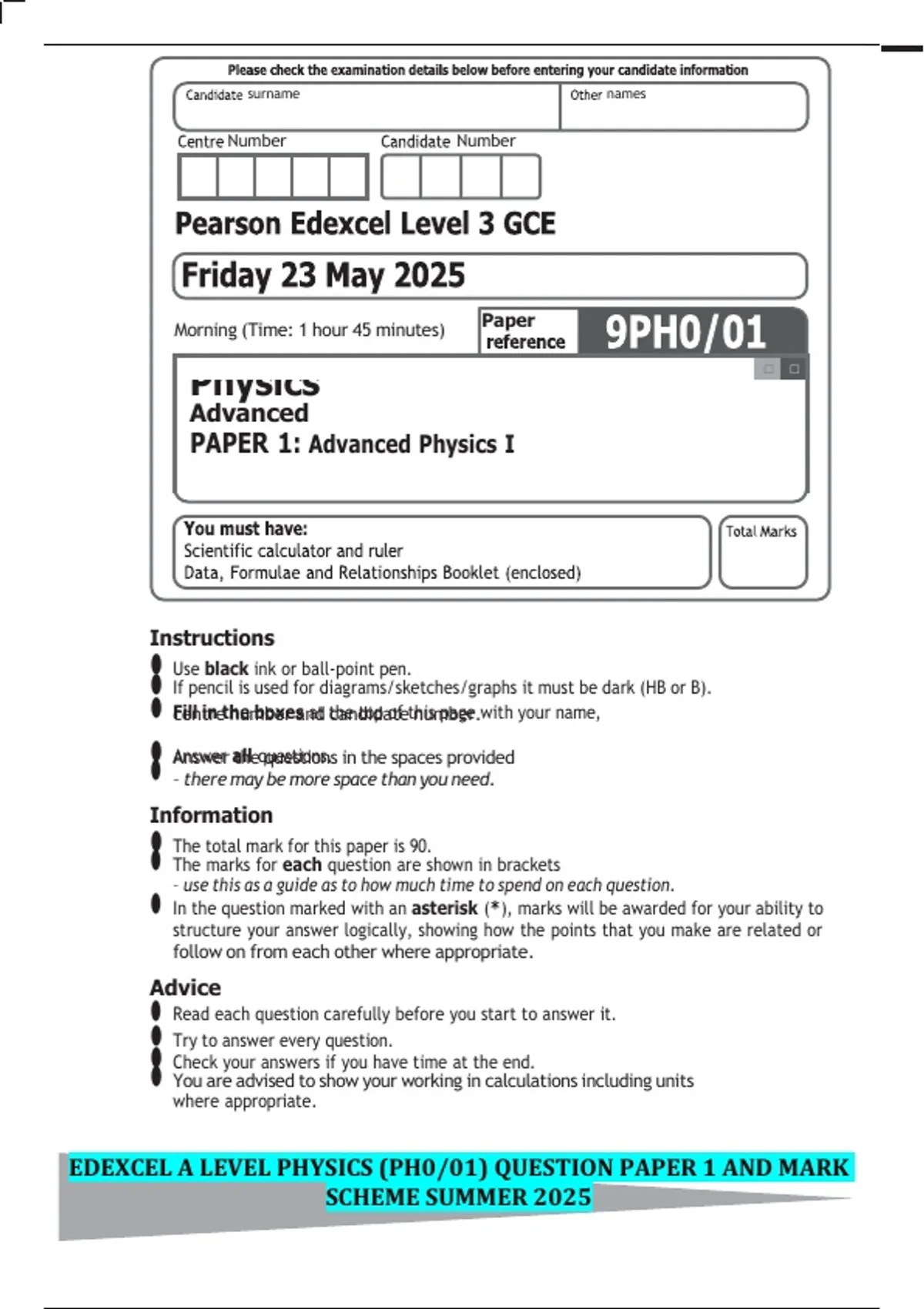EDEXCEL A LEVEL PHYSICS (PH0/01) QUESTION PAPER 1 AND MARK SCHEME SUMMER 2025